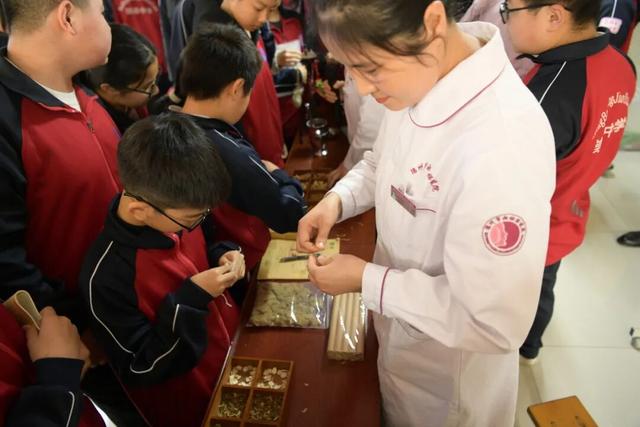 同学们在医生的指导下学习制作预防流感的中药香囊
