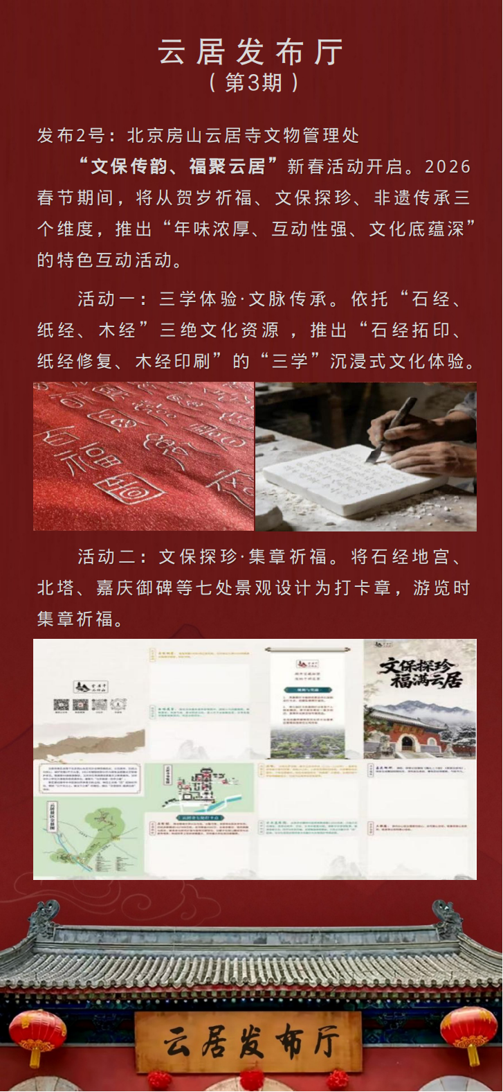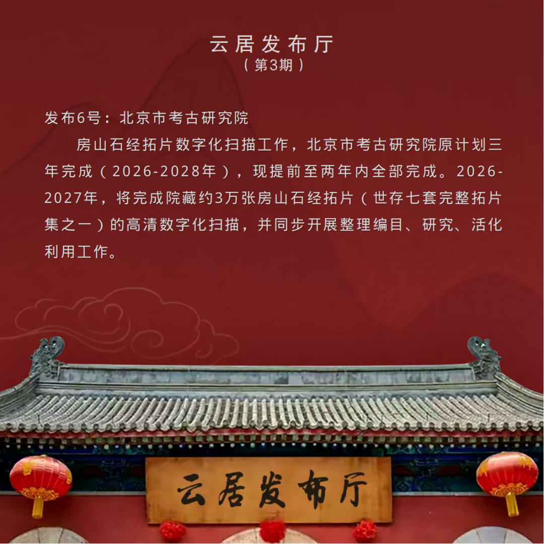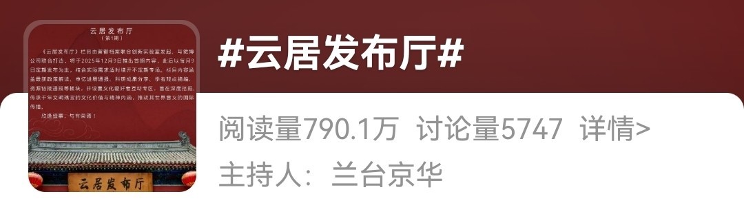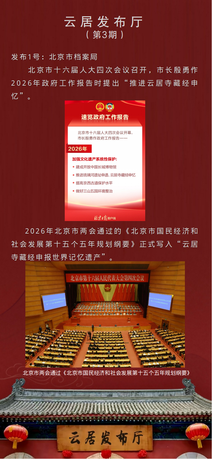 《云居发布厅》栏目,由首都档案联合创新实验室发起,与微博公司联合打造,2025年12月9日推出首期,此后以每月9日定期发布为主并适时增开不定期专场。栏目内容涵盖最新政策解读、申忆进展通报、科研成果分享、学者观点阐释、资源链接通报等板块,并设置文化爱好者互动专区,旨在深度挖掘该传承千年文明瑰宝的文化价值,推动国际传播。中华宝藏,现世重光。欣逢盛事,与有荣焉!
