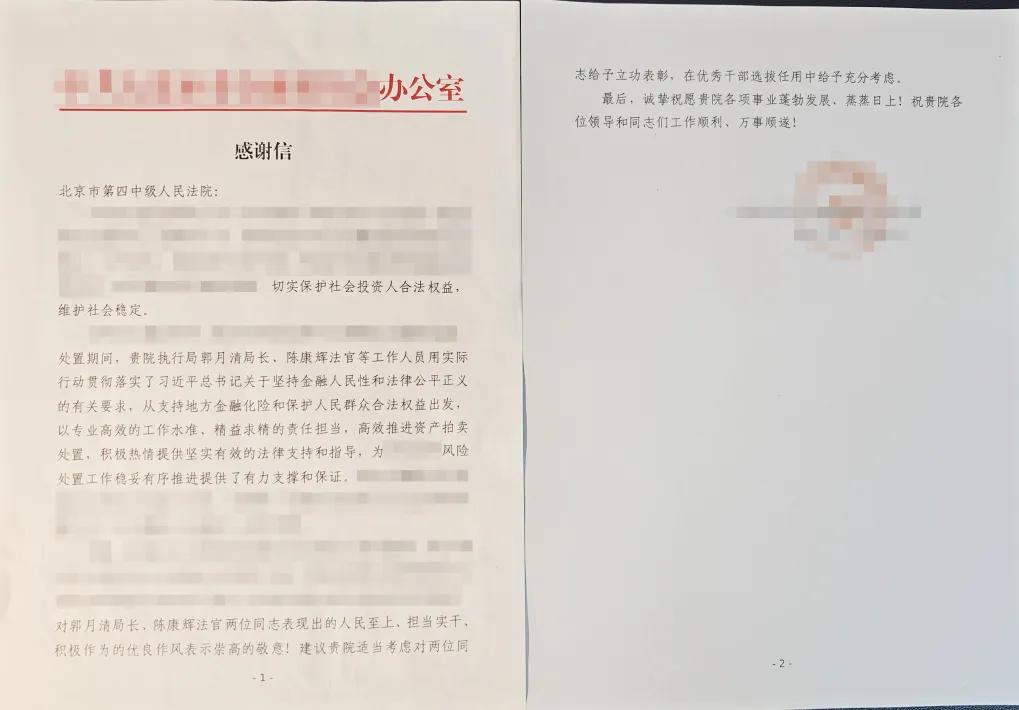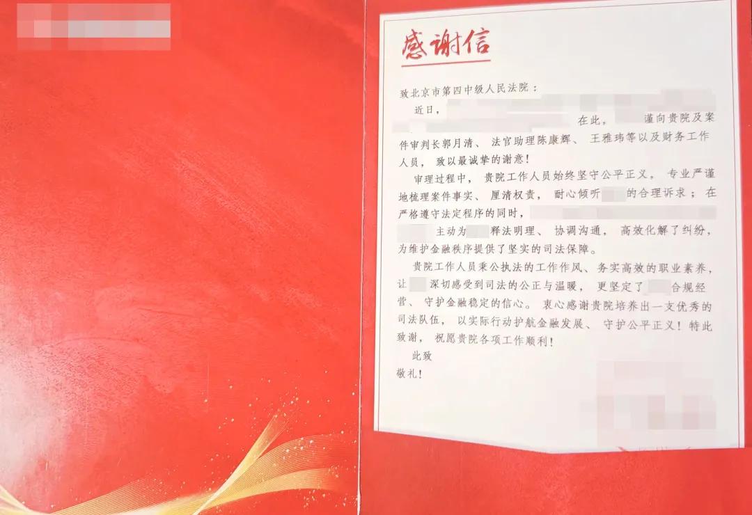 案件顺利执行后,北京四中院将“尊重法律、尊重企业、尊重事实”原则贯穿始终,有效化解了涉企执行纠纷,增强了企业对司法环境的信任,为北京市营造“稳定、公平、透明、可预期”的营商环境提供了有力司法支撑。某地委金融委员会向北京四中院寄来《感谢信》,感谢北京四中院为当地金融风险化解工作稳妥有序推进提供了有力支撑和保证。申请执行人某银行专程送来《感谢信》及锦旗,赞扬北京四中院执行干警始终坚守公平正义、高效化解纠纷,为维护金融秩序提供了坚实的司法保障。