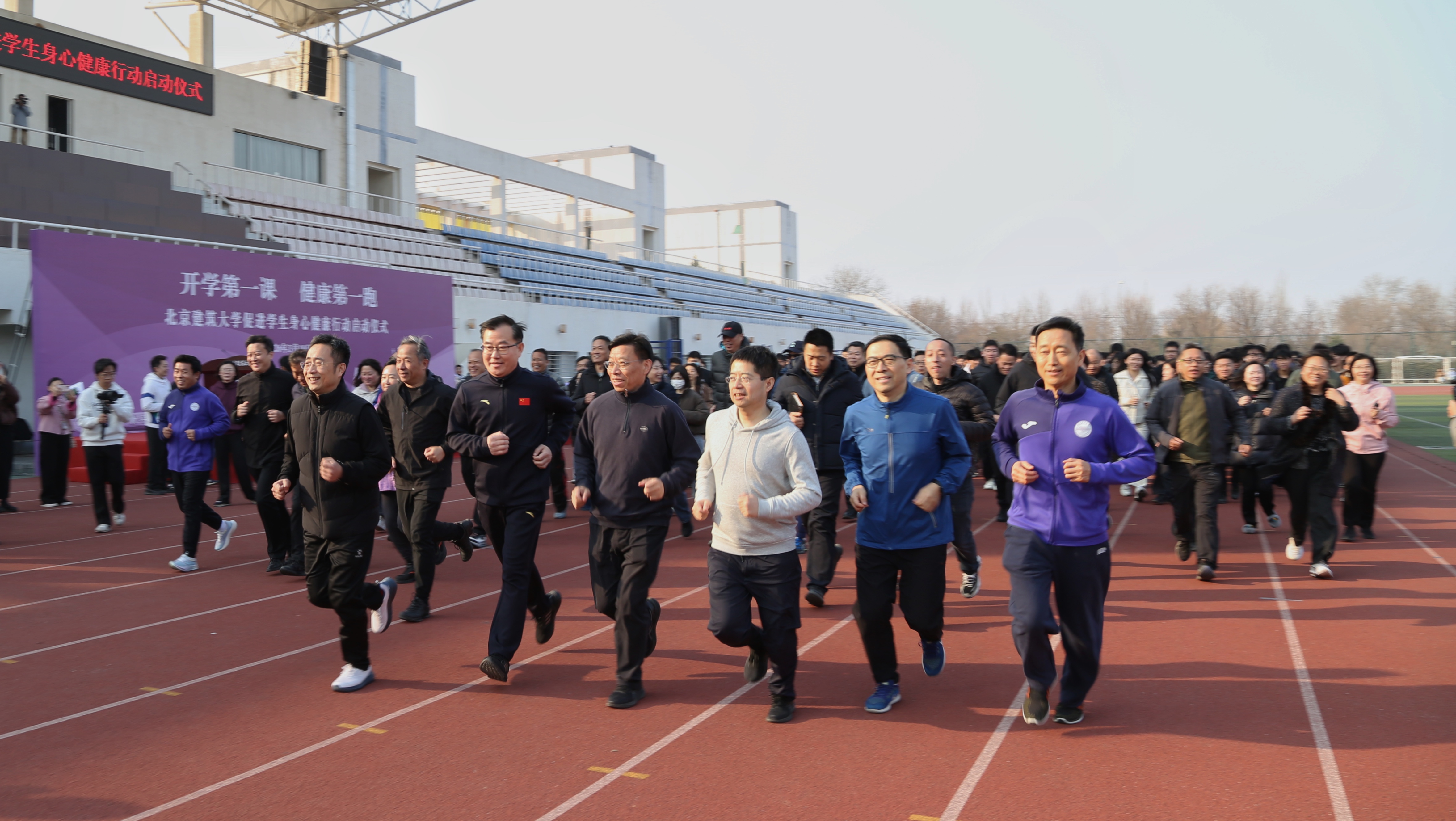 3月10日,春日暖阳下的北京建筑大学操场上人潮涌动,两千余名师生齐聚于此,以运动共同开启新学期。随着清脆的发令枪声响起,学校党委书记王攀和师生队伍浩浩荡荡地冲出起跑线,正式开启“健康第一跑”。跑在队伍前列的2024级硕士研究生野堯笑着说:“跑进新学期,这个创意很有趣,也很健康。这学期我打算加强锻炼,掌握更多科学的运动方法和技能。”