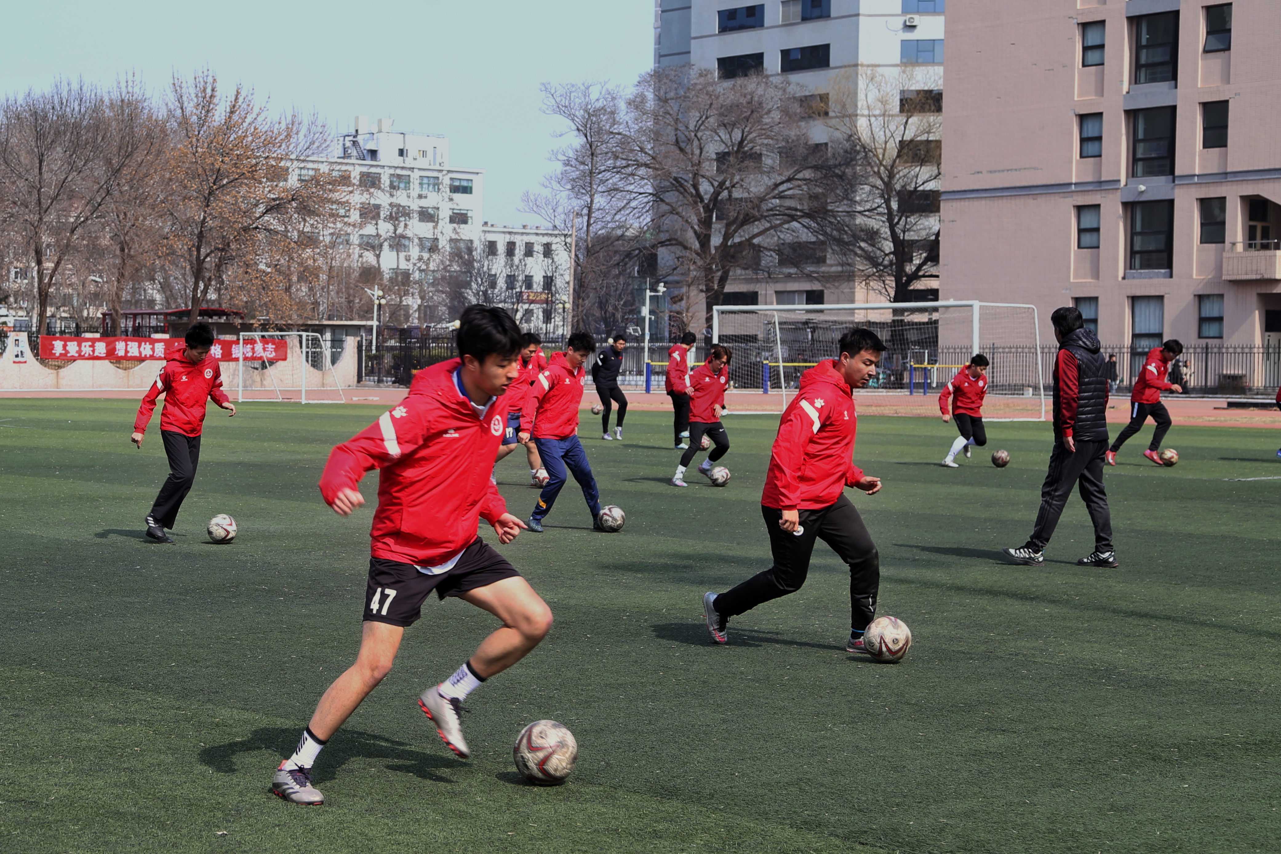 同一天,在中国矿业大学(北京)的足球场上,校足球队正专注地进行控球练习。绿茵场上,队员们脚下娴熟地带球推进,步伐稳健,动作连贯,在反复练习中打磨盘带技术。与此同时,室内体育馆里,篮球、排球、羽毛球的训练也如火如荼地进行着。