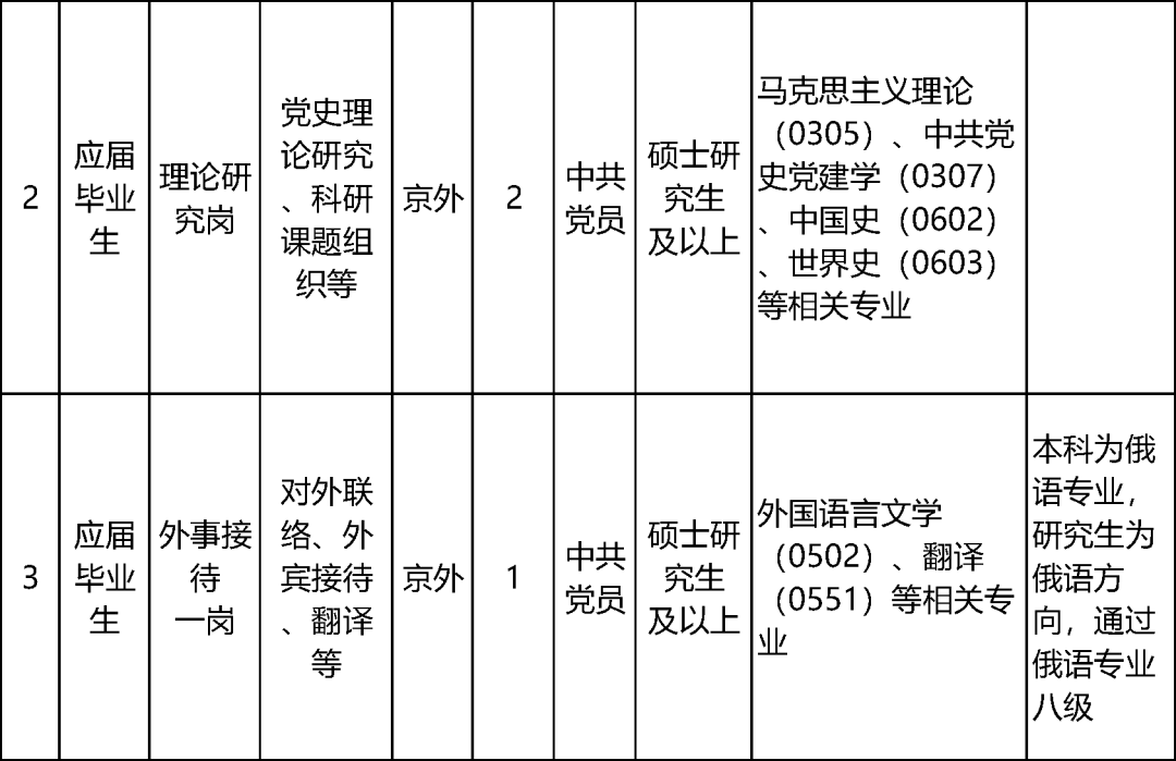 应聘人员须为2026年全国普通高等学校非定向应届毕业生(不含委培、部队院校,一般应在2026年7月底前取得相关学历、学位,含两年择业期内未落实工作单位的高校毕业生)。应聘人员毕业时须取得与最高学历对应的学历学位证书;岗位要求的专业条件为应聘人员即将获得的最高学历对应专业。其中,京内生源指入读高校前为北京市常住户口、不需要进京落户的学生。京内生源应聘人员可以报考符合条件的京外生源岗位。