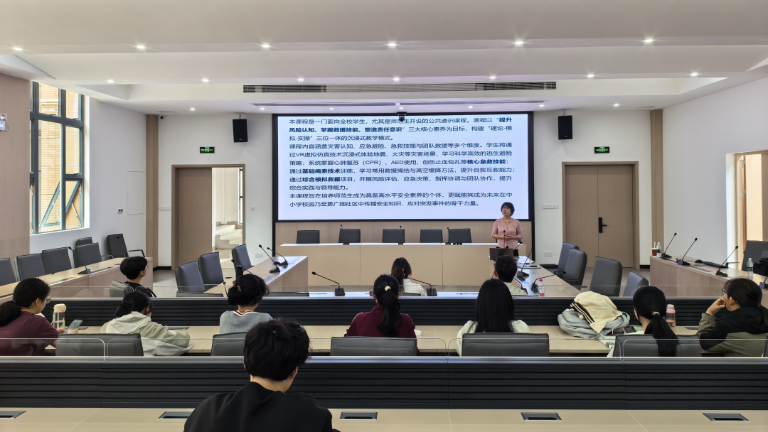 实践教学环节在教育部巨灾模拟与系统性风险应对国际合作联合实验室展开。在授课教师的指导下,同学们借助虚拟现实(VR)情景模拟系统、应急技能训练平台等前沿设备,沉浸式体验了地震、台风等典型灾害场景,学习了逃生与避险策略。在后续课程中,同学们还将系统学习心肺复苏(CPR)、自动体外除颤器(AED)使用、创伤止血包扎等核心急救技能;通过基础绳索技术训练,掌握常用救援绳结打法与高空缓降方法,切实提升自救与互救能力。此外,课程还设置了综合模拟救援项目,引导同学们在实际演练中进行风险评估、应急决策、指挥协调与团队协作,全面强化综合实践能力与领导力。