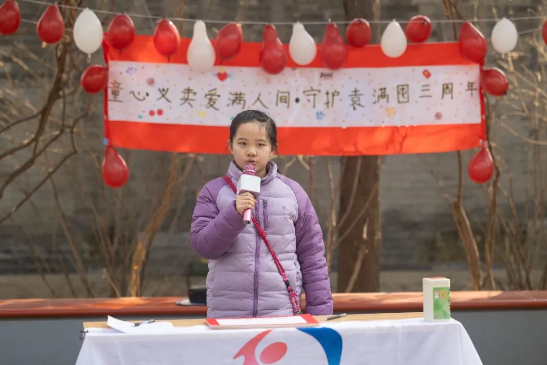 以“童心义卖·爱满人间”为主题的纪念活动正式开场,主持人依次介绍活动意义与到场嘉宾。守护小组发起人王幂淉走上前,讲述小组三年来的守护历程。“三年前,我们发现雕像周边环境需要维护,便萌生了成立守护小组的想法。”王幂淉说,从最初4名同学自发参与,到如今30余人的稳定队伍,大家风雨无阻排班值守,用日复一日的点滴行动守护红色印记。小组成员王瑀轩随后介绍柳荫街社区拥军传统:“柳荫街军民共建已有40多年历史,是北京市双拥创建标杆,‘柳妈妈饺子队’成立于2016年,如今早已成为爱军拥军的温暖符号。”生动讲述让在场同学与居民深切感受到这片土地的红色底蕴。