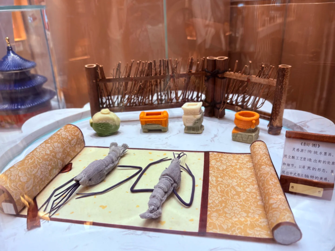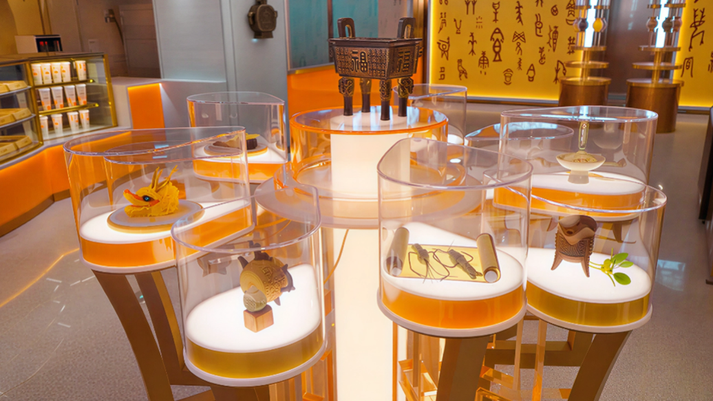橱窗里陈列的不是桃酥牛舌饼,而是青铜器——樽、鼎、簋,纹路清晰,青铜质感拉满。凑近看,才发现是糕点。
