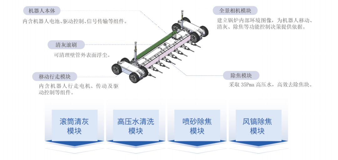 对于锅炉管壁的积灰、结焦,传统人工清洗不仅效率低,还容易因压力控制不当损伤管壁。吉泰智能为机器人搭载了35MPa和60MPa两种高压旋转喷头与压力自适应控制技术,还搭配了滚筒清灰、喷砂除焦、风镐除焦等模块,既能强力破除顽固结渣,又能精准控制压力不损伤水冷壁管壁。