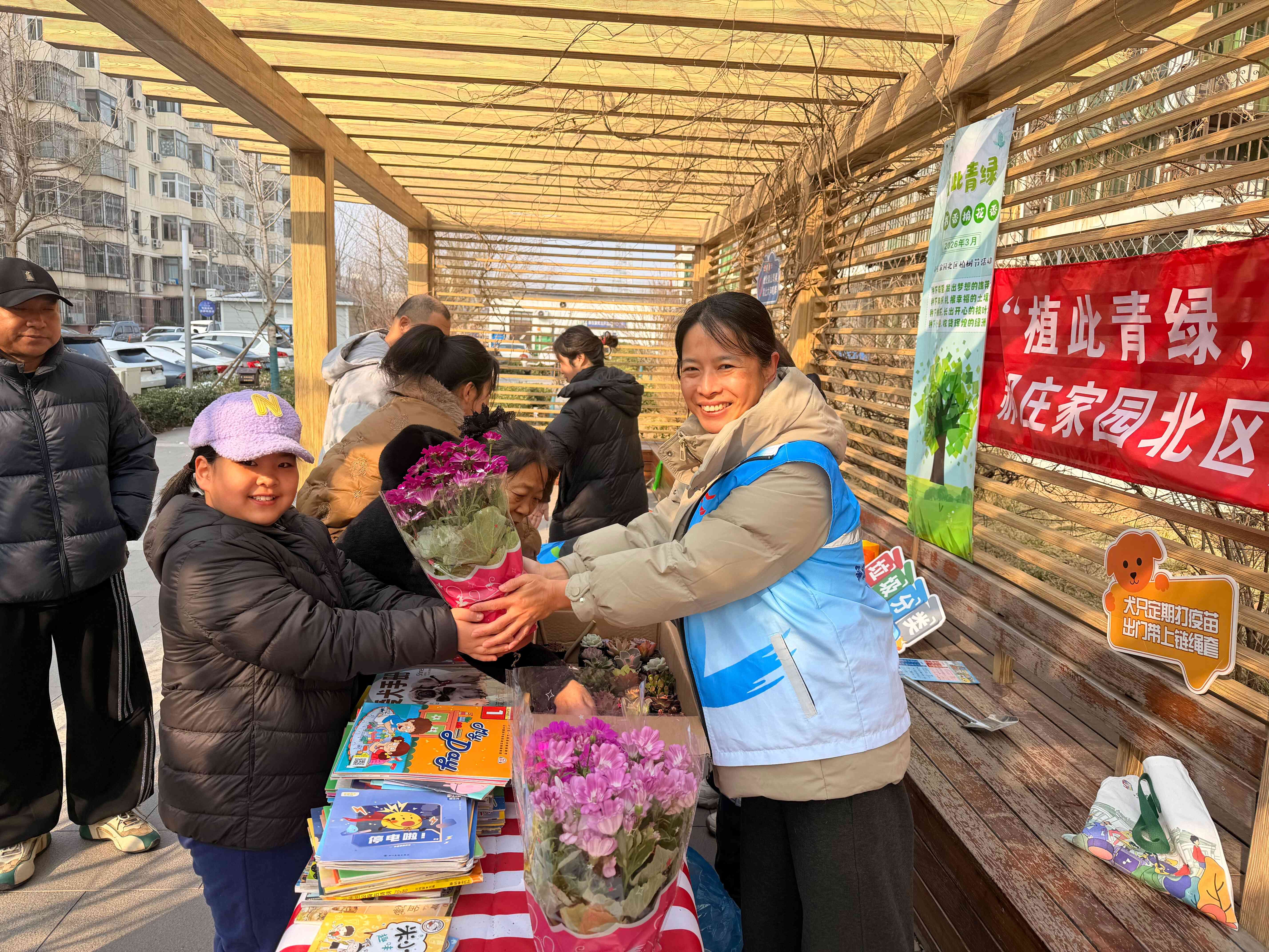 郝庄家园北区社区开展“植此青绿,以书香换花香”植树节公益活动。以“书香换花香”为主线,鼓励居民将家中闲置书籍带到现场兑换多肉盆栽、鲜花等礼品,践行绿色循环理念。一位小朋友专程捐赠《爱犬管理手册》,呼吁文明养犬,赢得现场点赞。青少年们积极参与捐书种绿,用稚嫩双手传递文明与温情。活动共募集图书100余册,将充实社区图书室,助力书香文明建设。此次活动将植树节与公益、阅读、创城深度融合,有效提升了居民对文明城区创建的参与度和认同感。