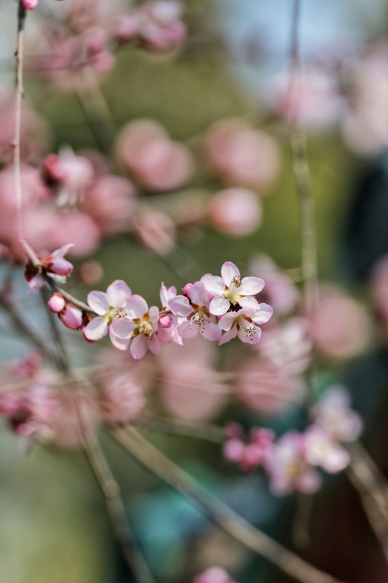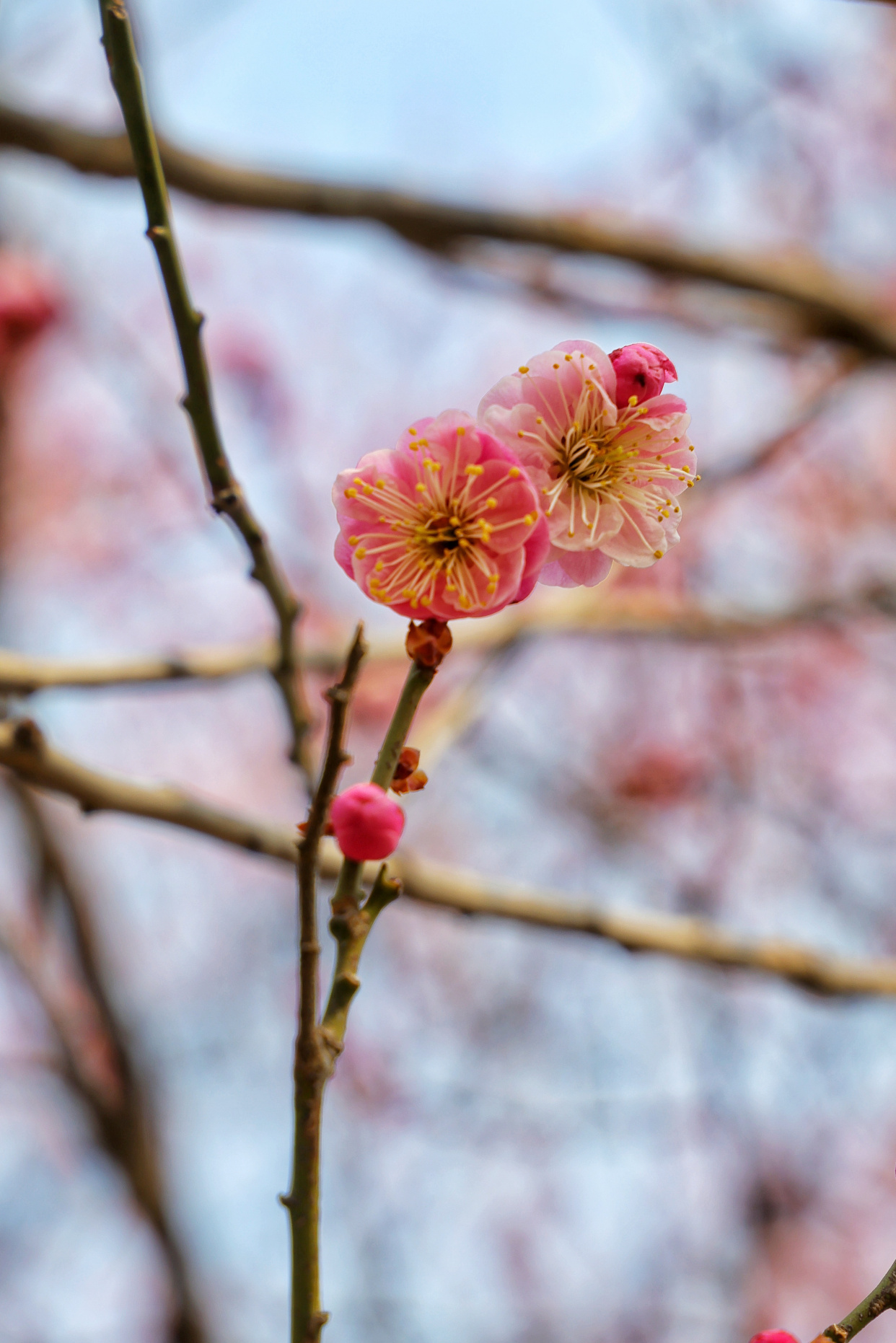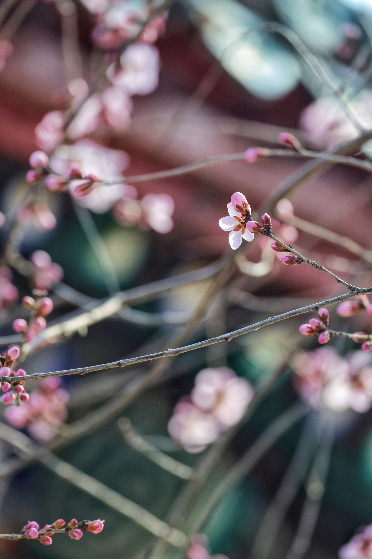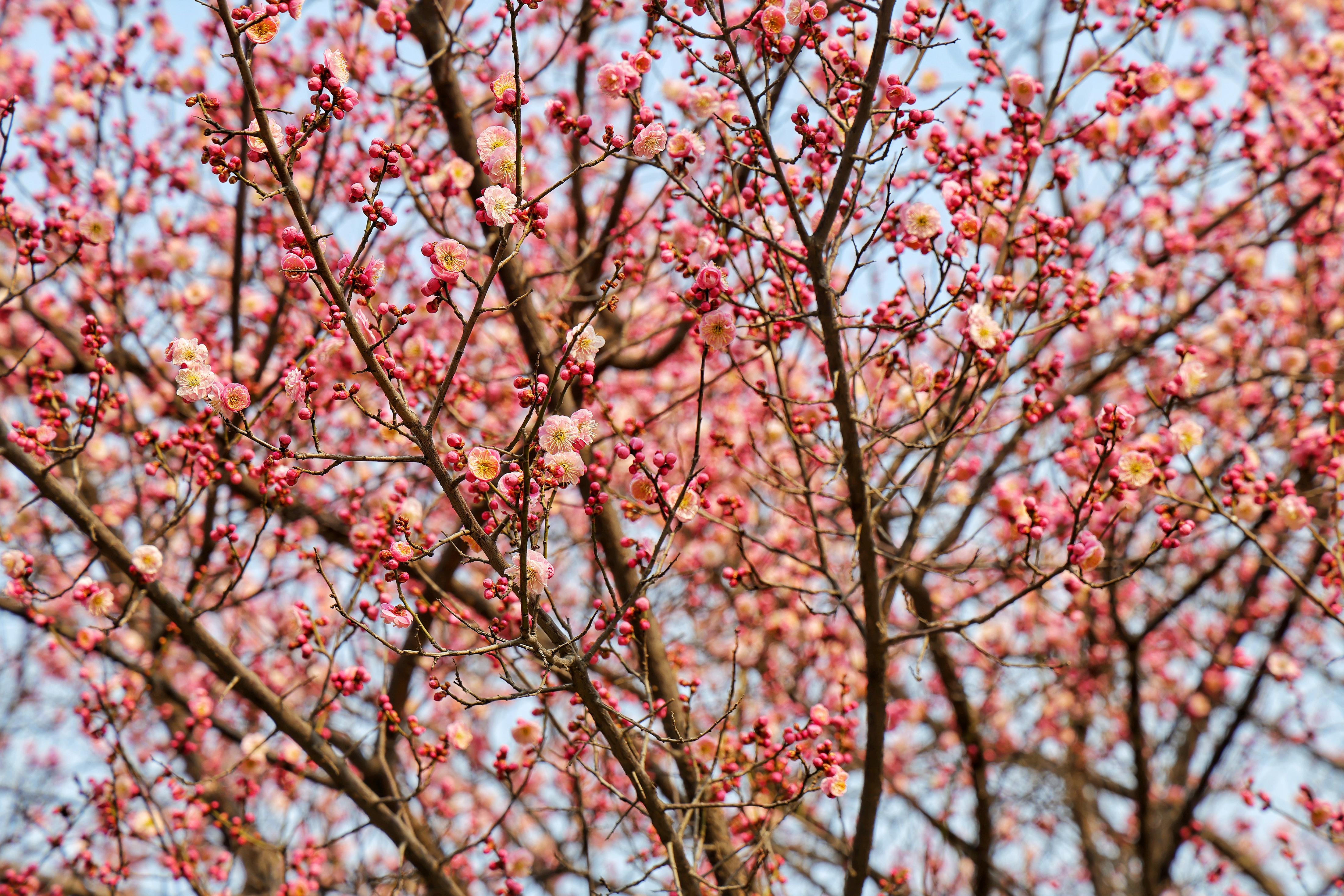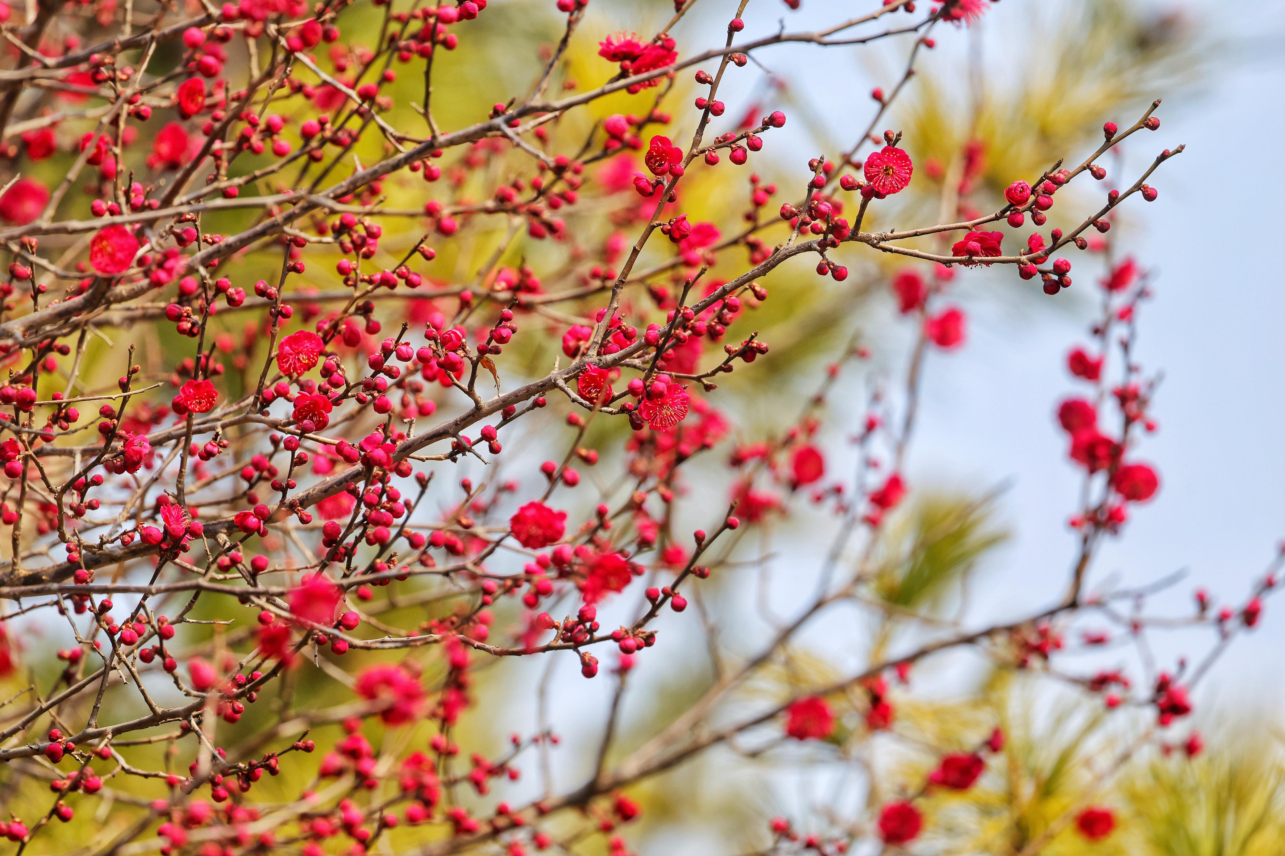 梅花却要矜持些,有的已然盛放,粉瓣凝香,有的含苞待放,娇羞藏韵,暗香萦绕间,尽显早春雅致。