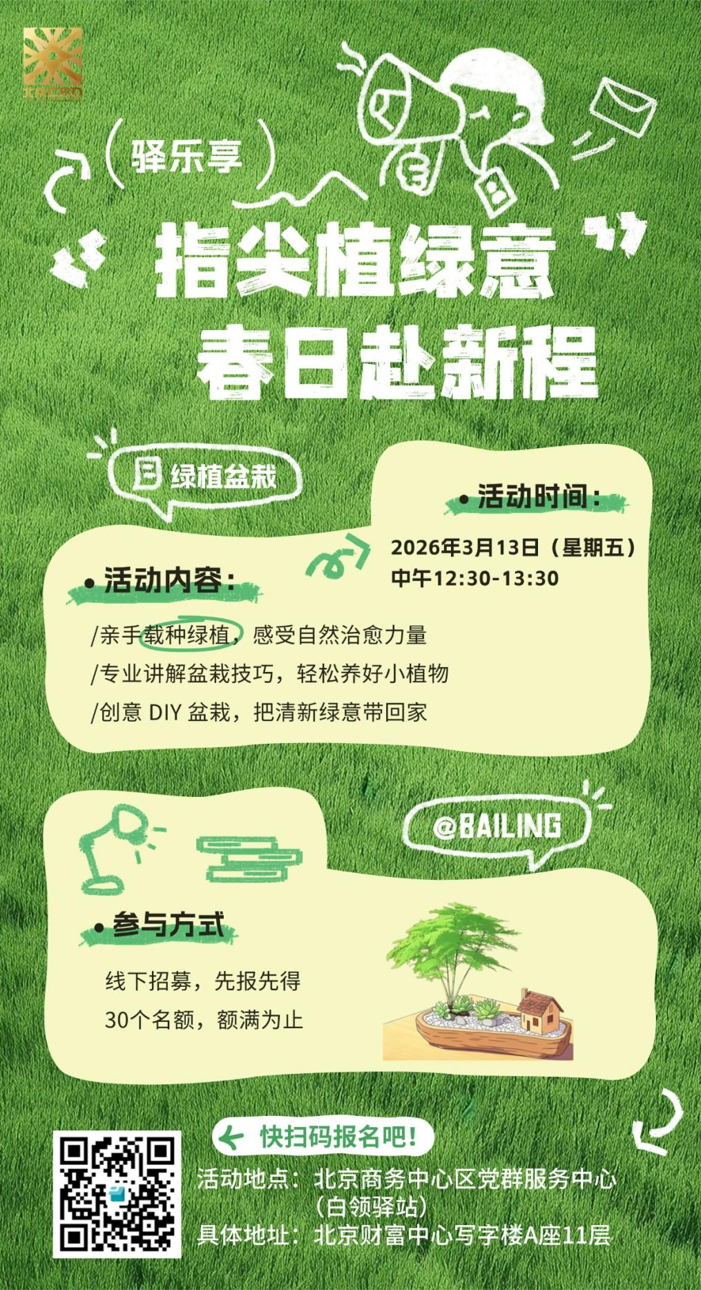 为进一步提升广大CBD白领的生态环保素养,厚植绿色发展理念,让白领们亲近自然、舒缓身心,亲手感受绿植带来的治愈与美好,北京商务中心区党群服务中心特开展“驿乐享——指尖植绿意 春日赴新程”多肉盆栽DIY活动。通过指尖耕耘与创意搭配,引导白领争做生态文明建设的积极践行者与推动者,以巧手匠心播种绿色希望,为生活增添一抹清新怡人的盎然绿意。