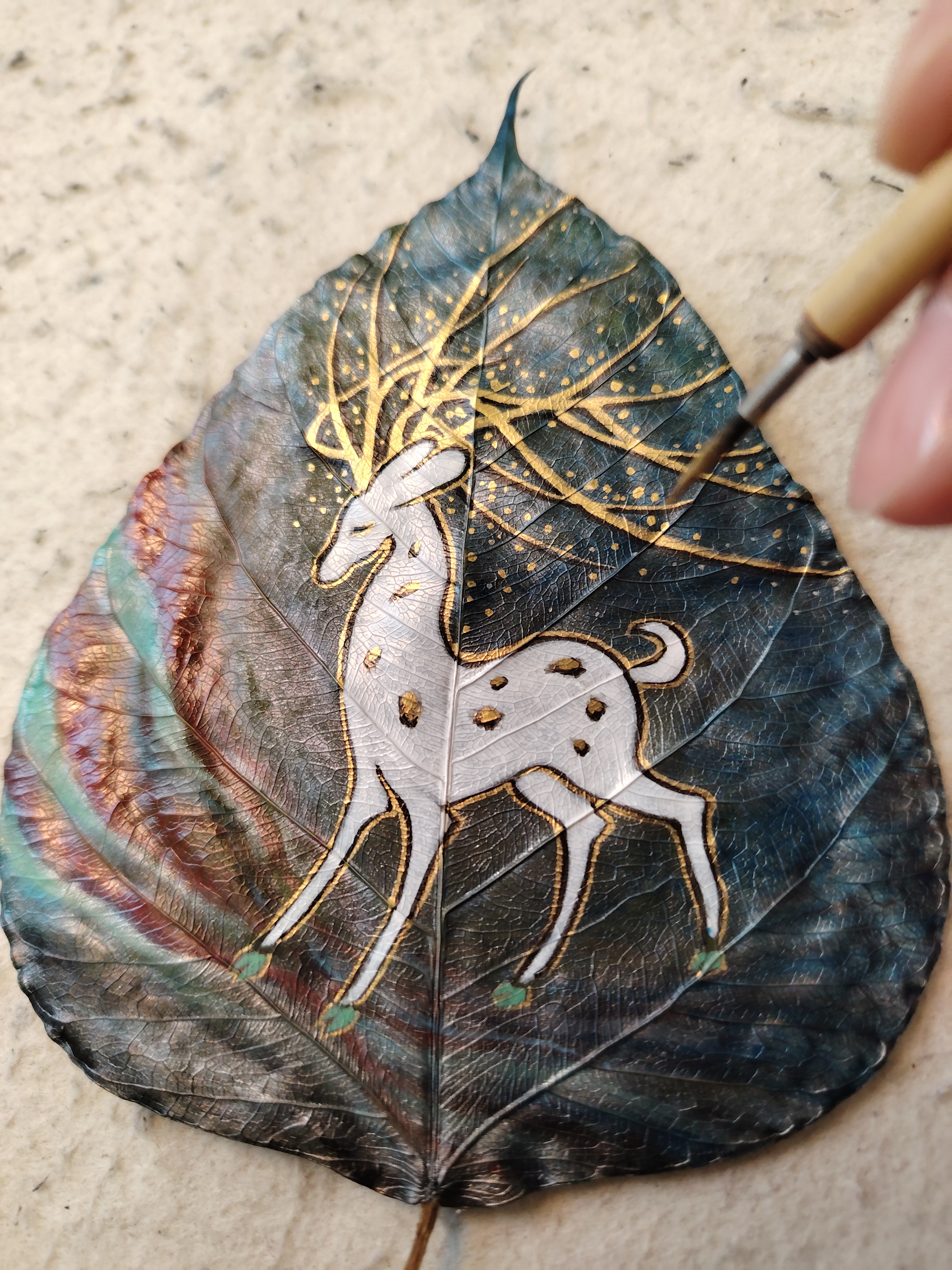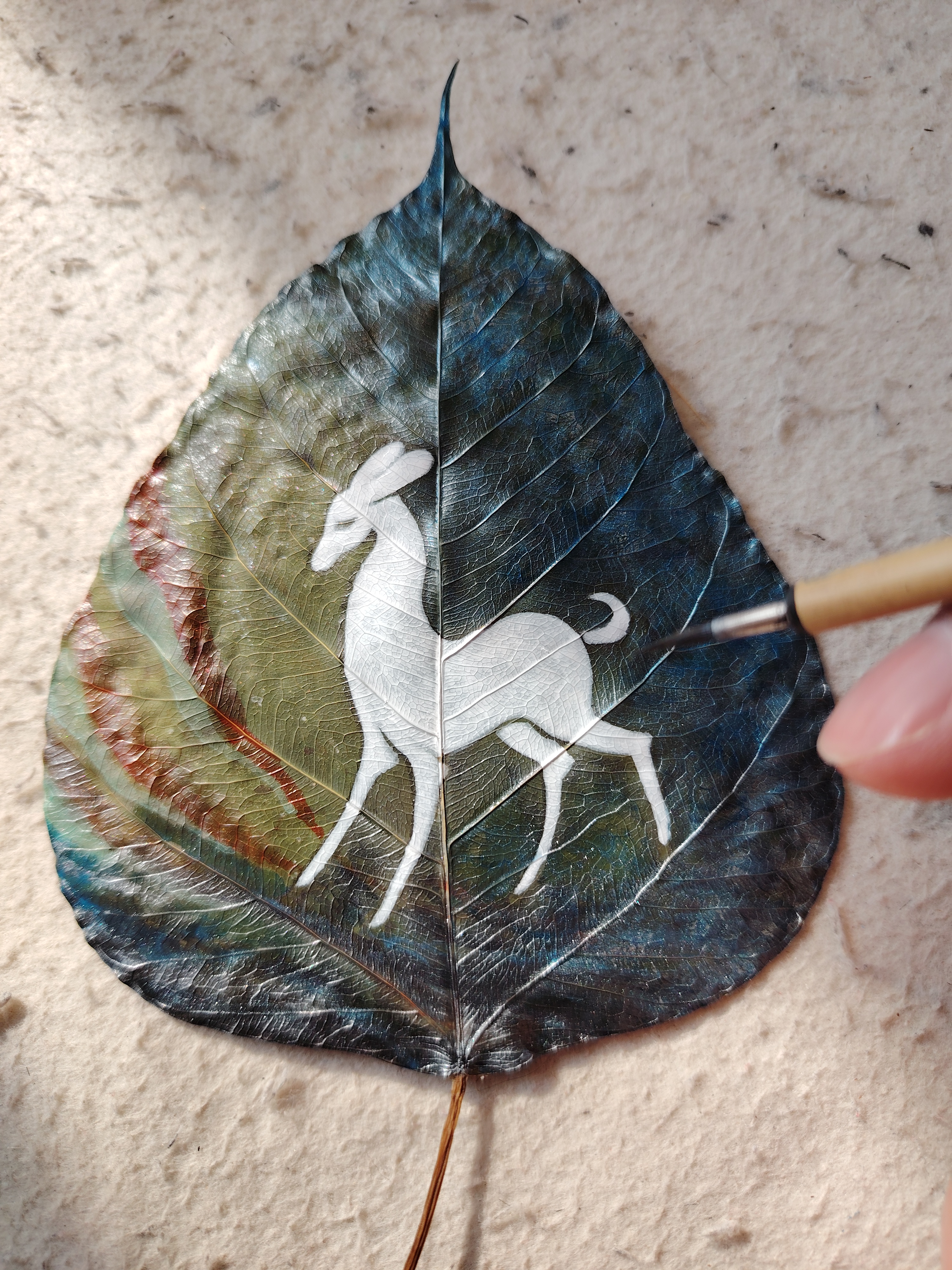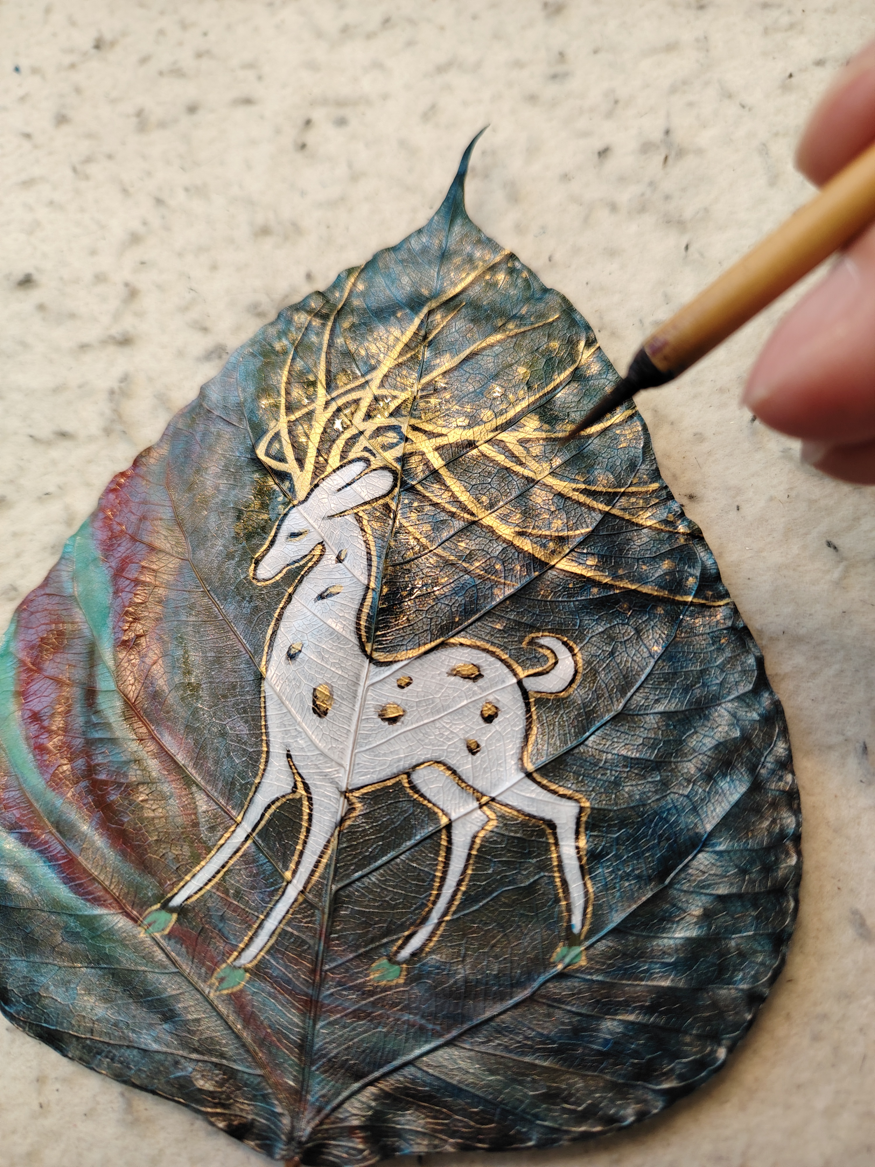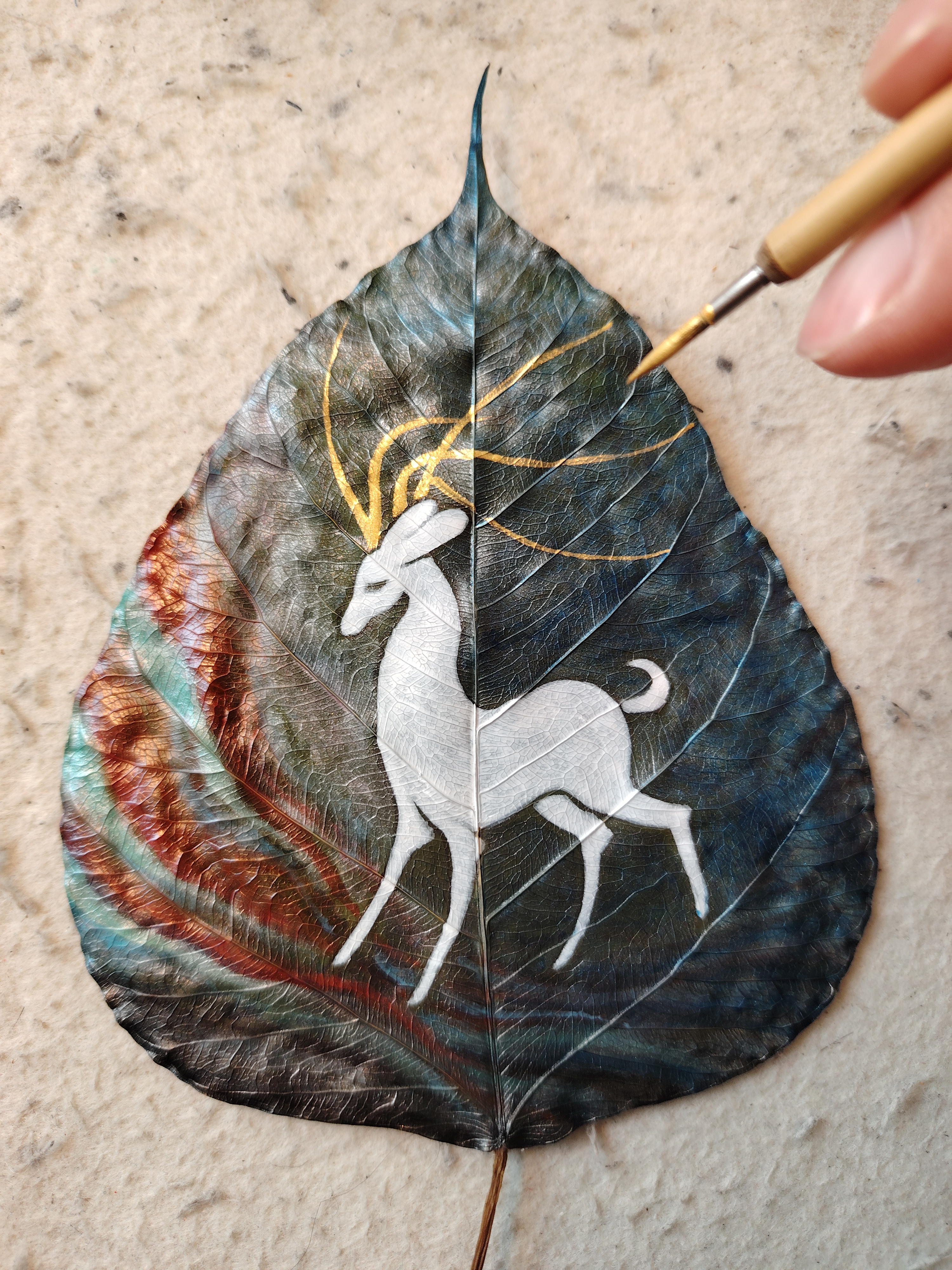 今以来自印度菩提树叶创作《鹿王本生》,此树乃是释迦牟尼悟道之树。感谢友人的珍藏,使我得以在古树叶上创作,过程很美妙。