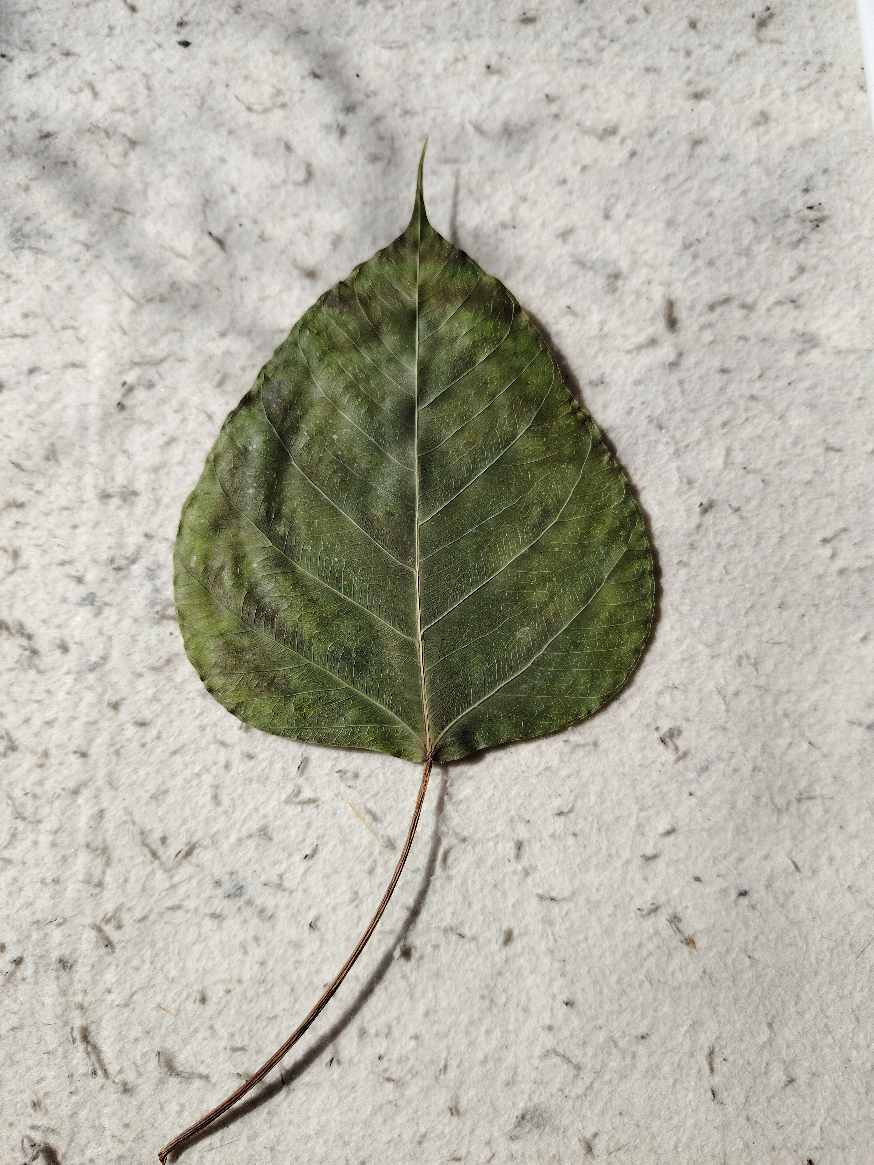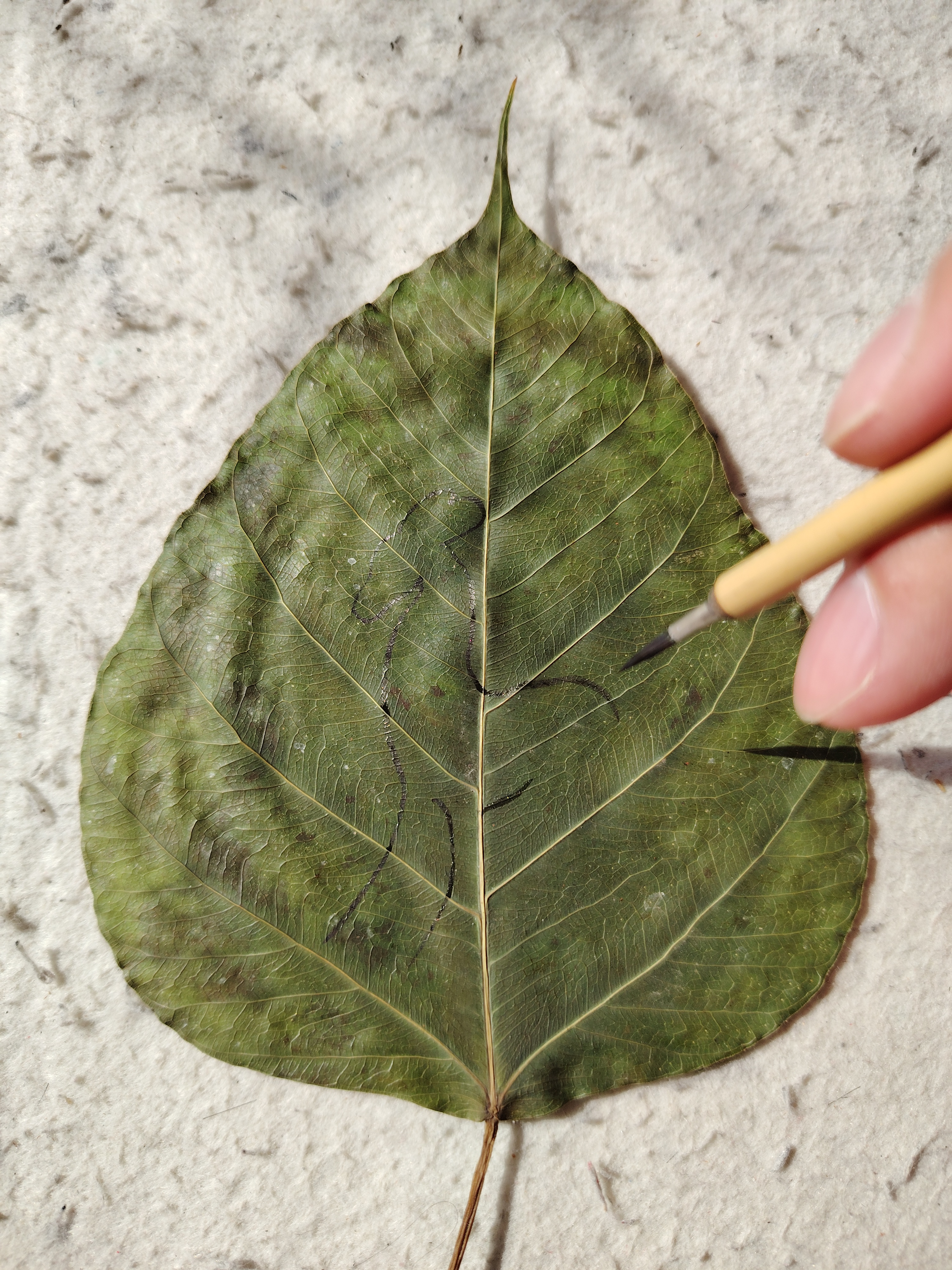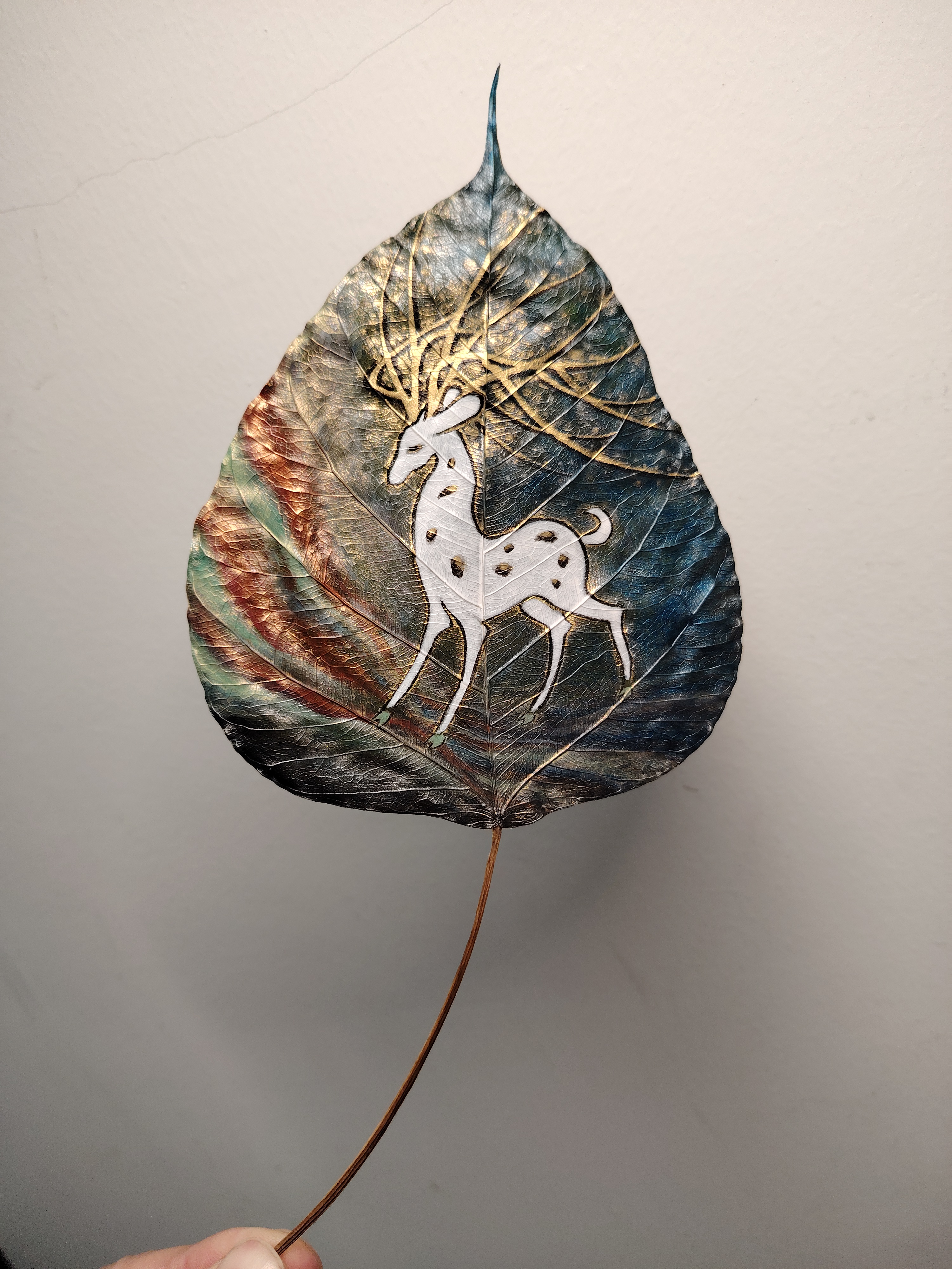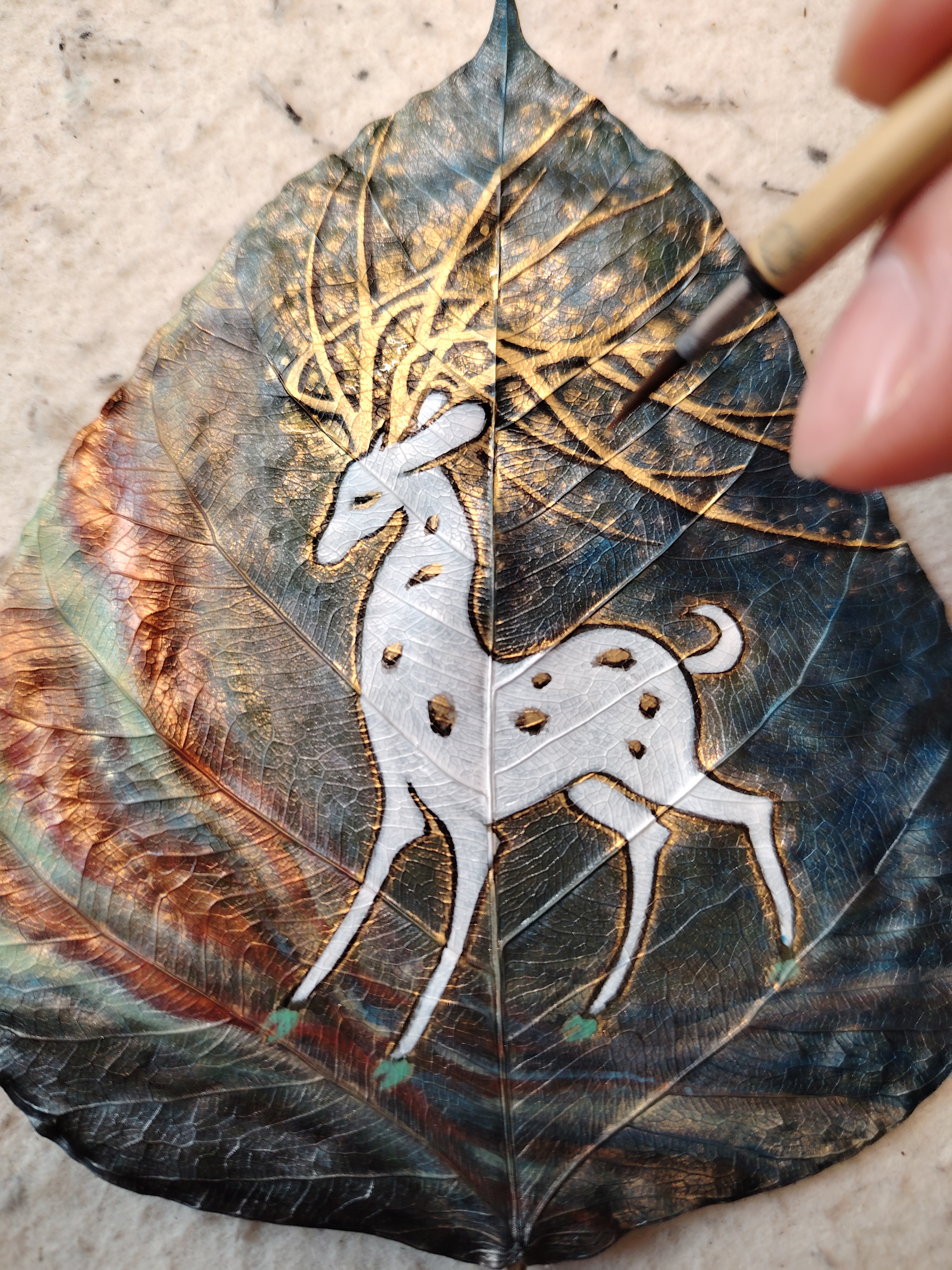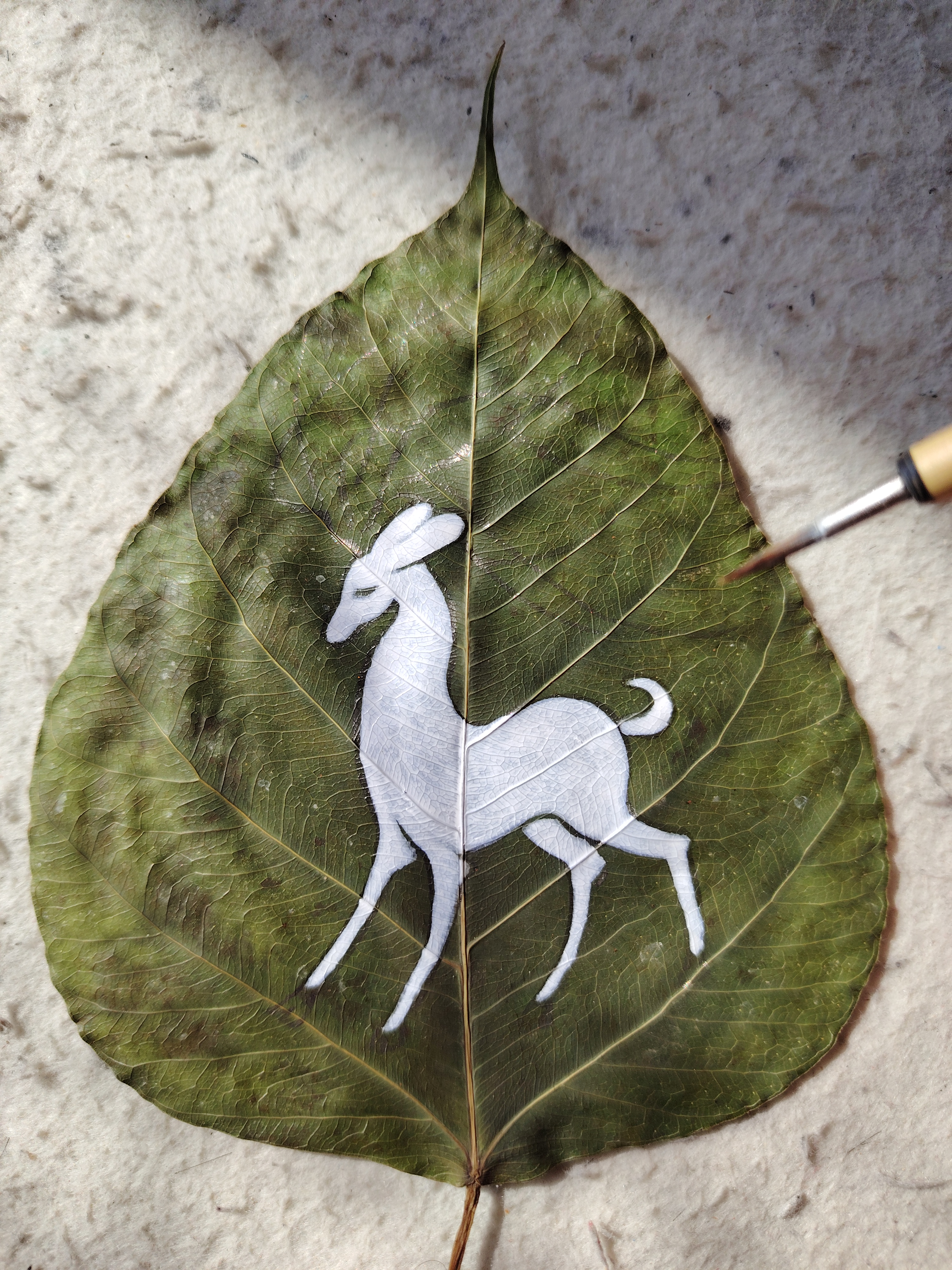 今以来自印度菩提树叶创作《鹿王本生》,此树乃是释迦牟尼悟道之树。感谢友人的珍藏,使我得以在古树叶上创作,过程很美妙。