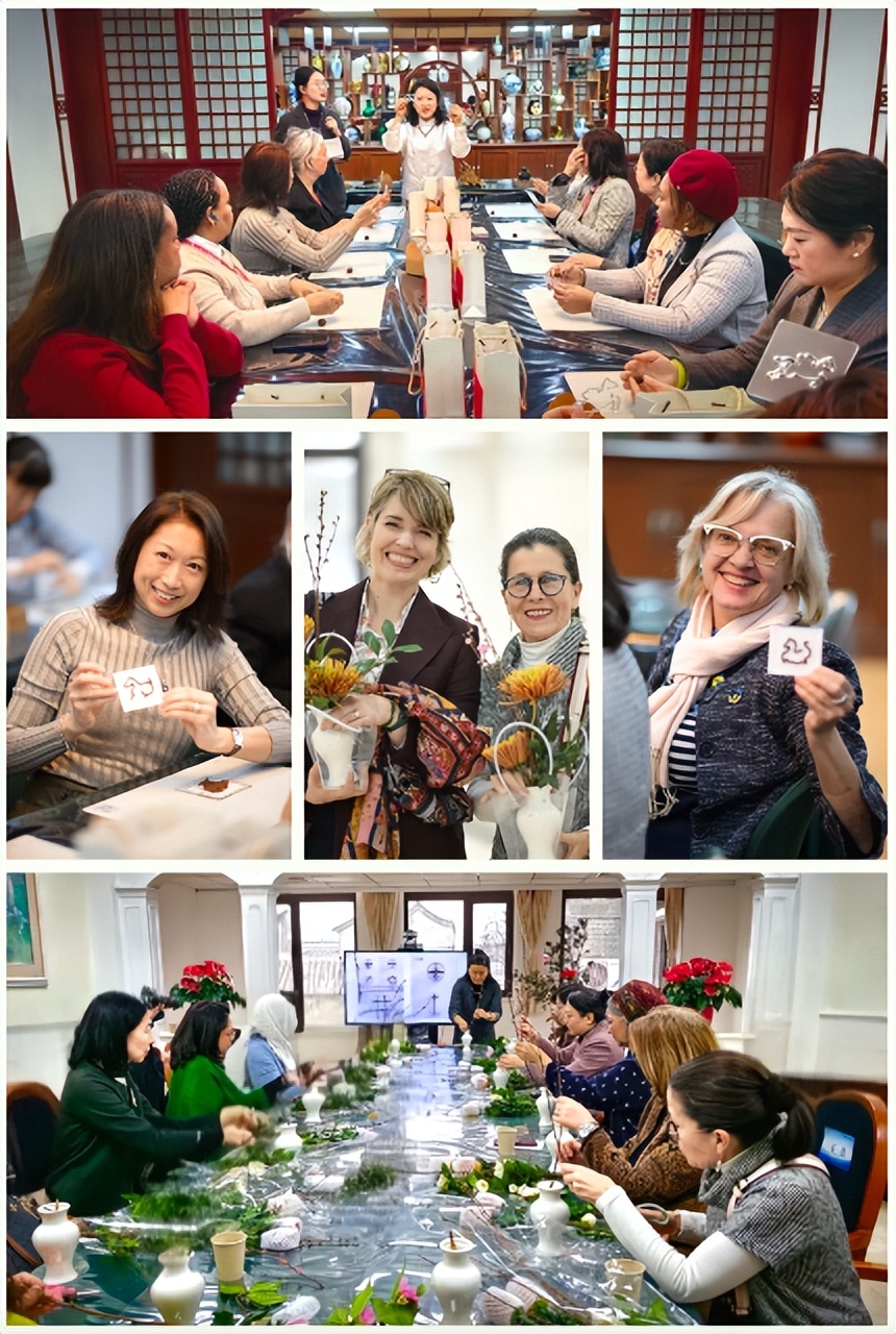 夫人们还沉浸式体验了中国香道和中式插花。在香道品鉴区,香道师现场讲解香文化发展历史,展示各式香品、香器,示范印香制作,夫人们一招一式学习制作印香,一朵朵“祥云”、一个个“福”字在夫人们手中渐渐成型。在中式插花体验区,花艺师一边讲解中式插花的历史和美学主张,一边指导夫人们选择花器和花材,进行自主创作,一件件充满创意的插花作品应运而生。赤道几内亚大使夫人表示,女性如花朵一般美好,绚丽生长、光芒绽放,祝福世界上每一位女性,都能自信、自爱、实现自身价值。