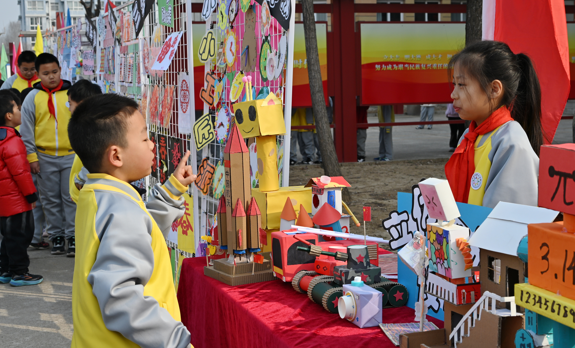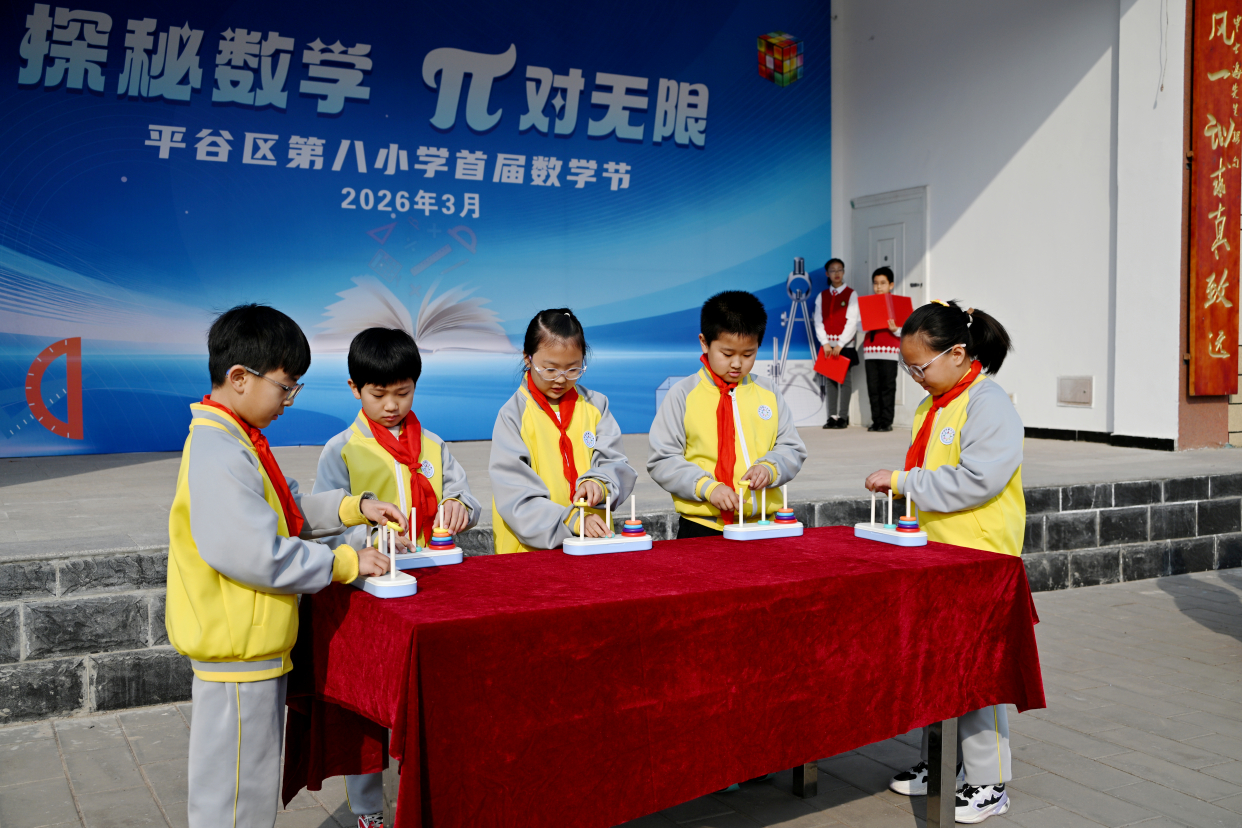“平移是直着走,旋转是转圈圈,轴对称是照镜子,我们可以这样形象地理解数学知识……”3月12日,北京市平谷区第八小学“探秘数学,π对无限”首届数学节启幕,“运动图形设计”展板前小讲解员的生动解读,引得师生频频点赞。这场为期三个月的数学盛宴,让数学走出课本,带领孩子们解锁其无限魅力。