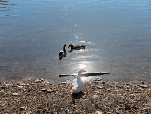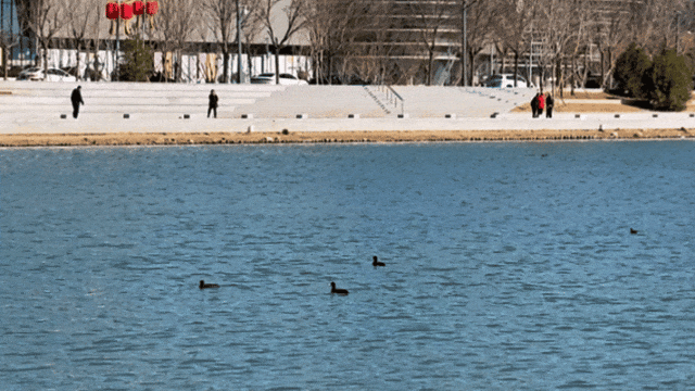 湖水泛着柔波,鸭子结伴游过,搅碎了枝头的倒影。