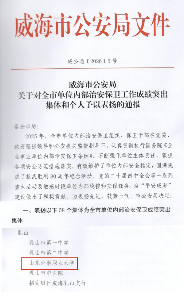 近日,威海市公安局对2025年度全市单位内部治安保卫工作成绩突出集体予以表彰。山东外事职业大学凭借扎实的安保工作根基和重大活动期间的出色表现,被评为“2025年度单位内部治安保卫成绩突出集体”,彰显了学校在校园安全管理工作中的扎实成效。