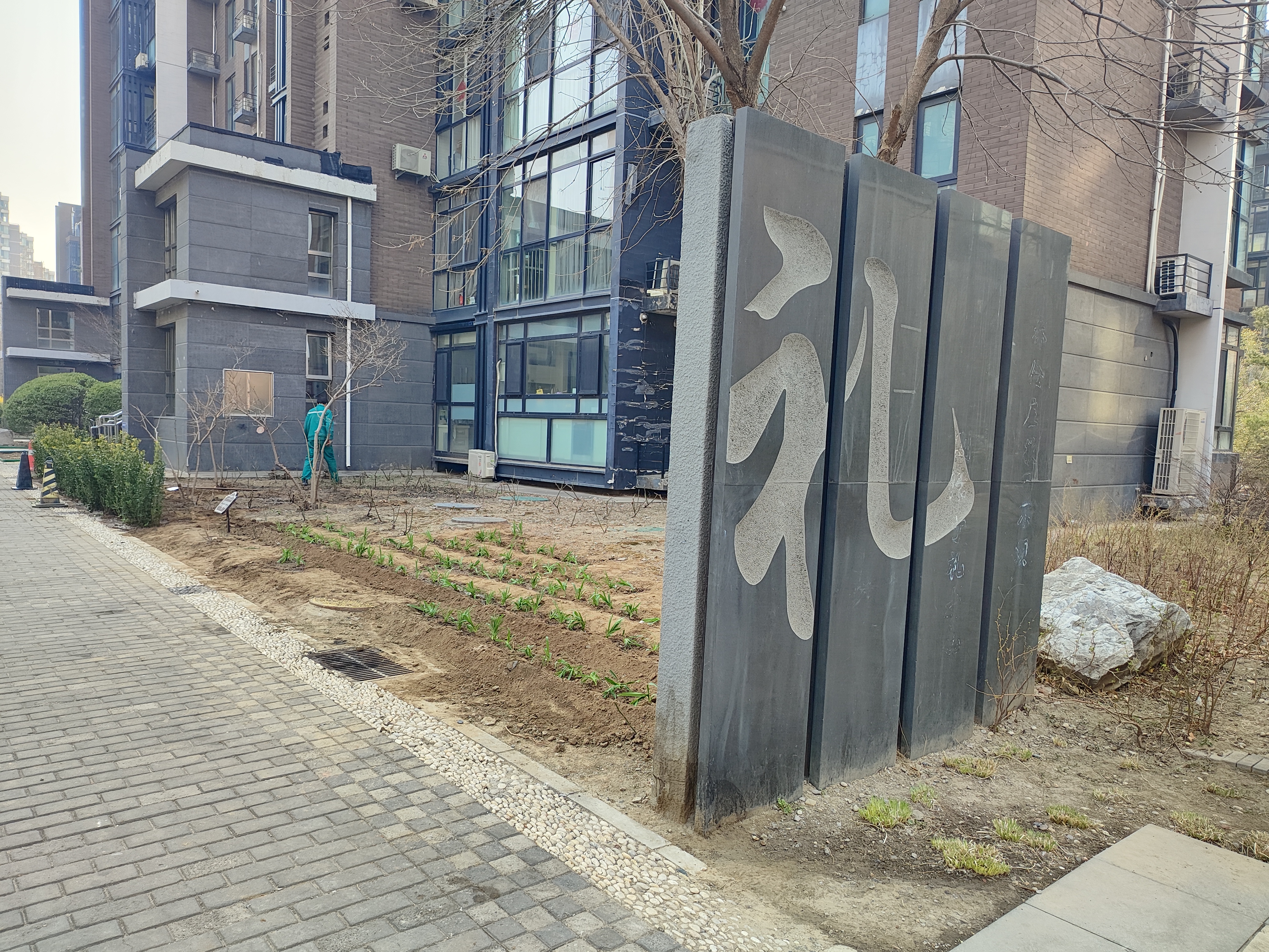 植绿的场地藏着小惊喜,空地旁立着古朴的“礼”字碑刻文化墙,古色古香的碑刻挨着待栽的黄杨、萱草苗,绿意交融着古韵,让这场护绿行动多了几分别致,也让“推门见绿、移步赏景”的花园社区愿景,变得触手可及。