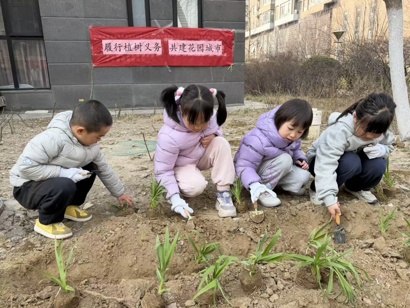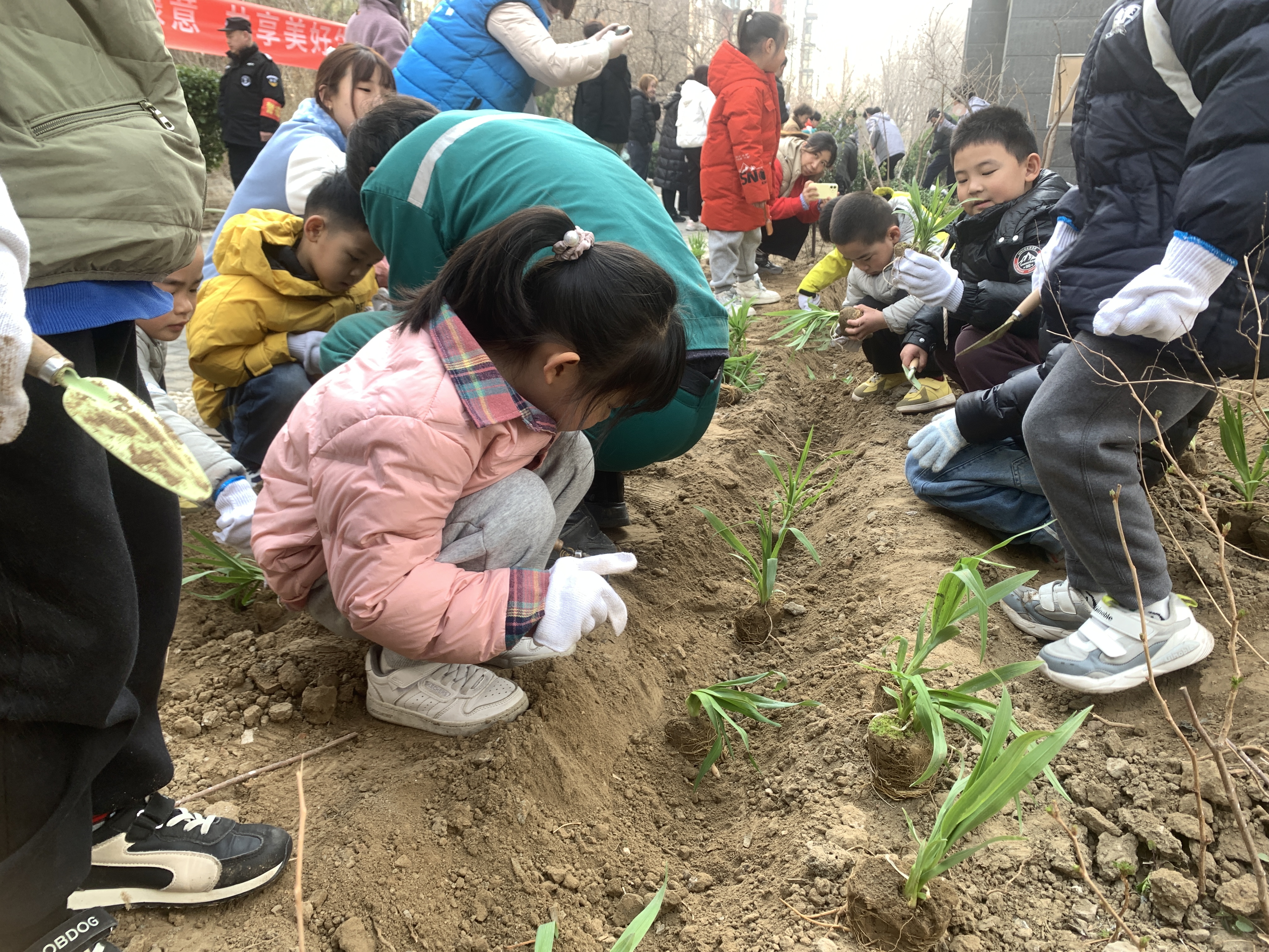 建工物业的工作人员全程做好保障,递工具、整场地、及时搭把手;社区工作人员穿梭在人群中,帮小朋友扶稳小树苗,和大朋友们一起忙活。政企民携手同心,春日的空地上,一派热火朝天又温馨和睦的景象,处处透着生机勃勃的美好。