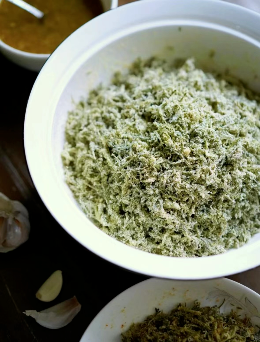 白蒿最常见的做法是蒸菜疙瘩,拌上面粉上锅蒸熟,出锅后撒上蒜末、辣椒,“滋啦”一泼热油,香气扑鼻,入口是绵软清鲜,蒜香裹着油香,一口上头,连吃三碗都不够!