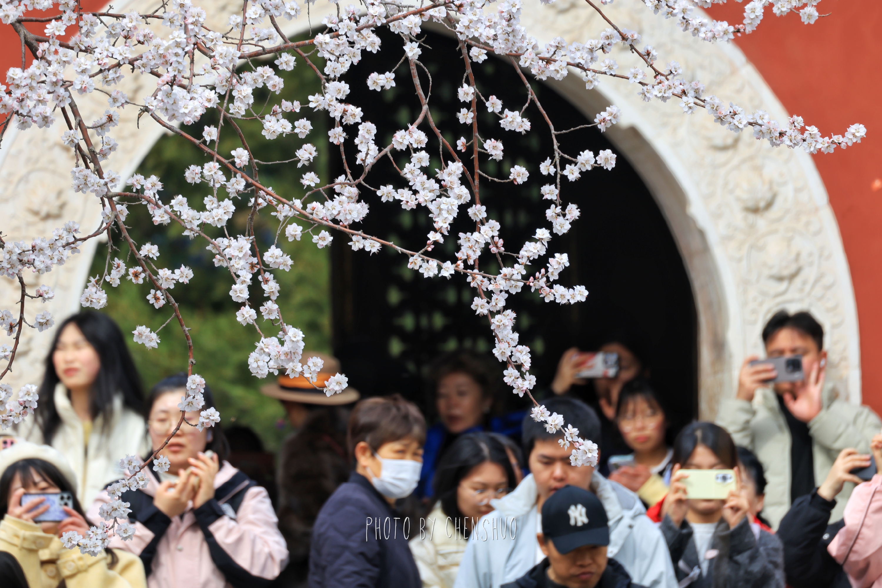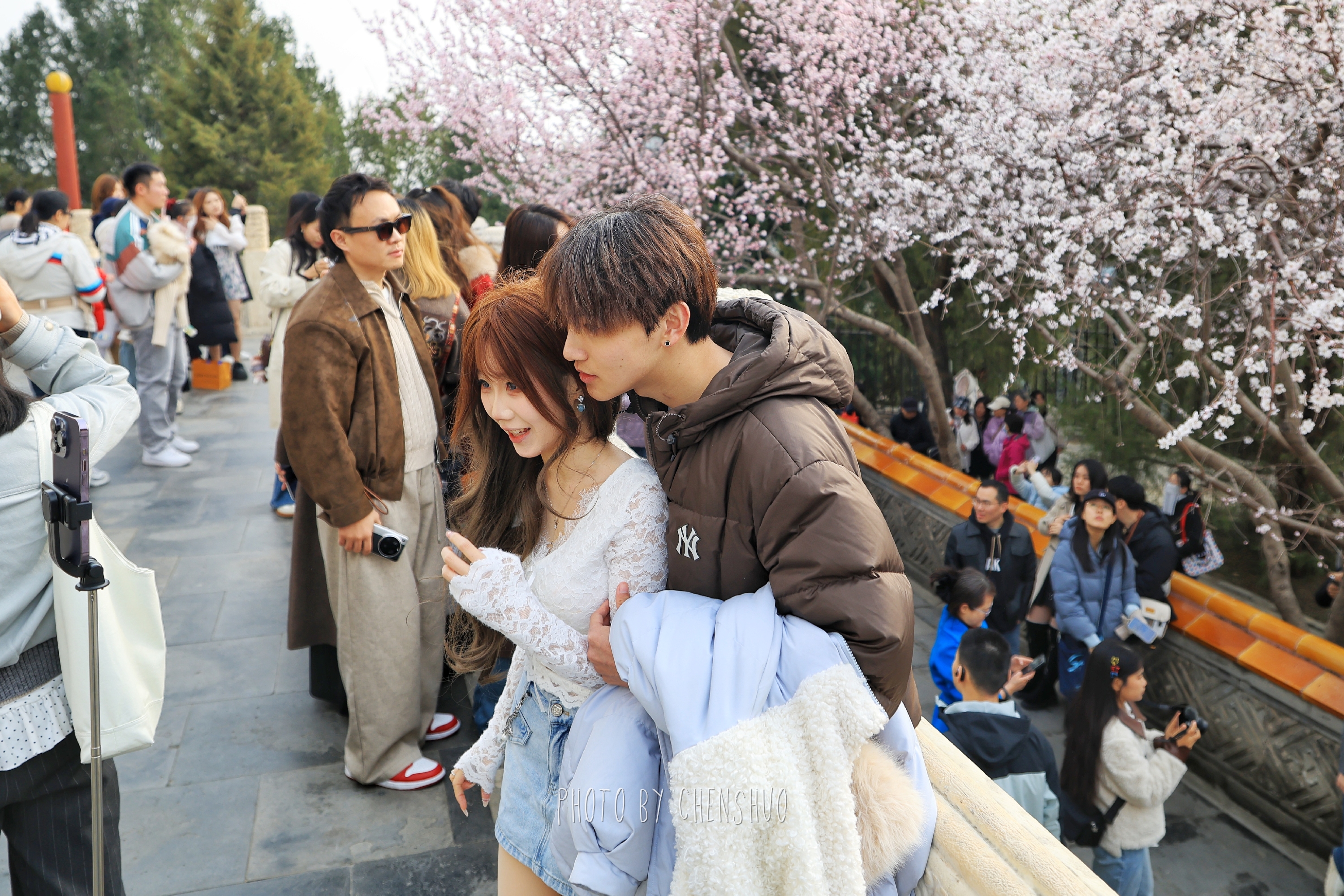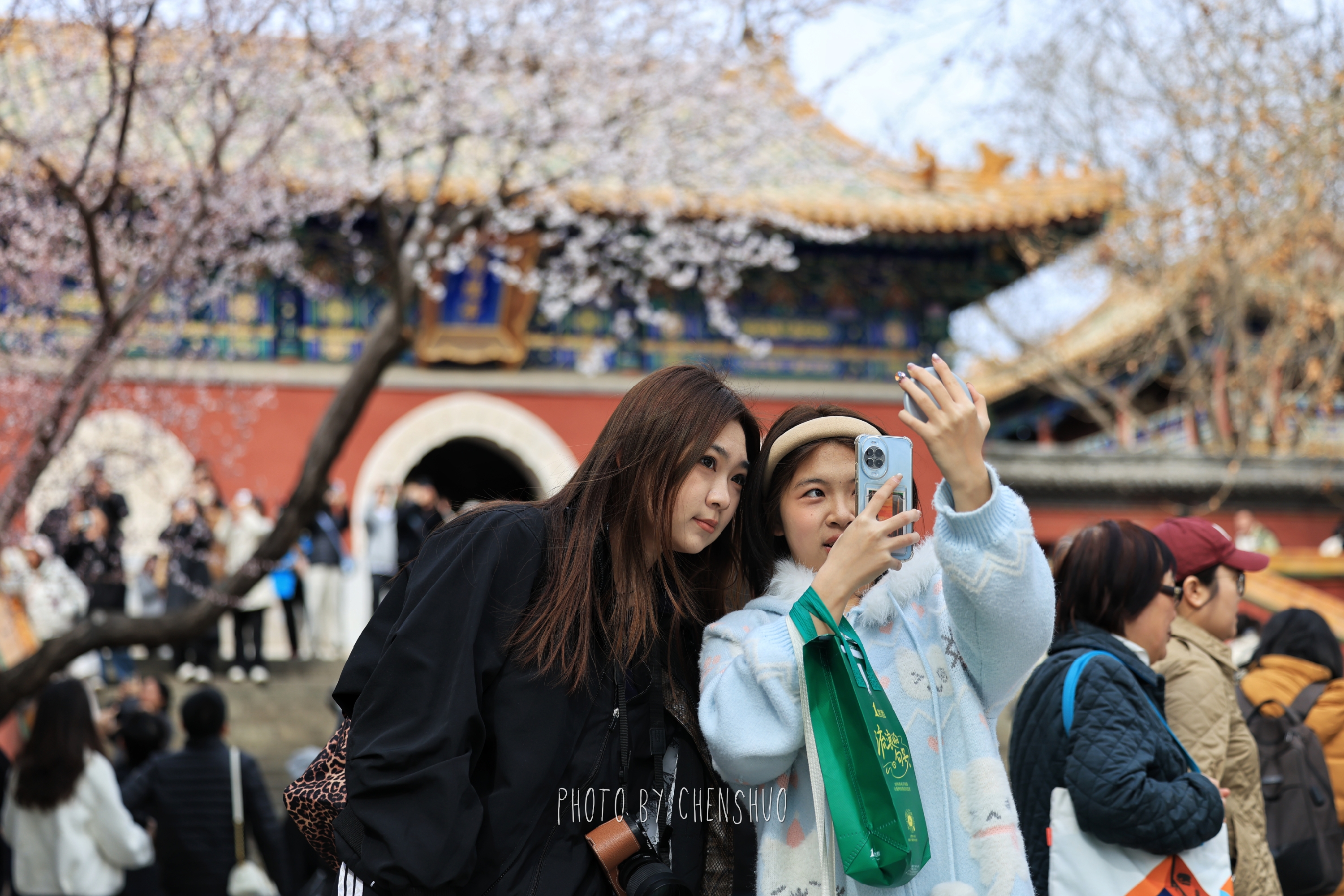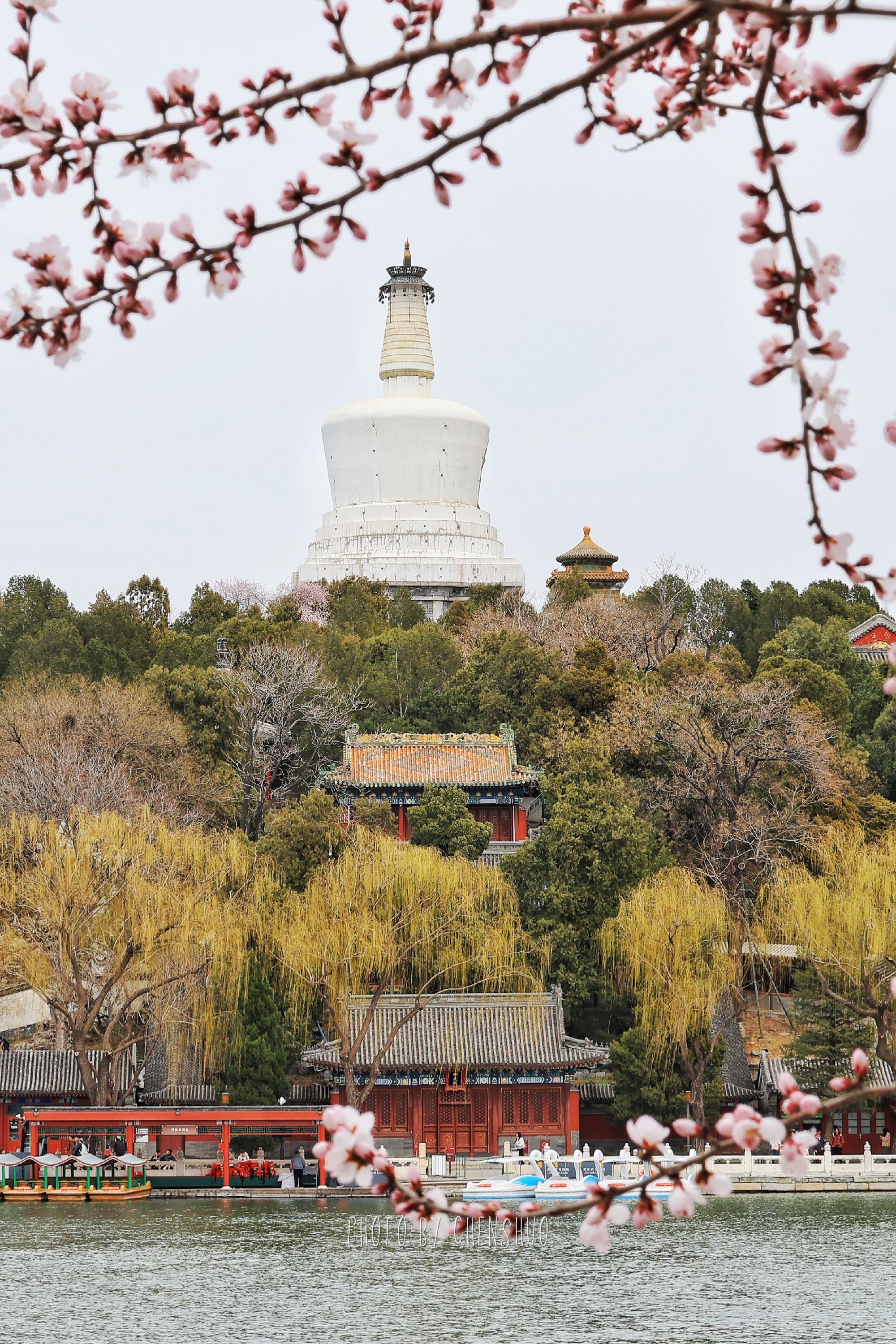 赏花热度同步拉满。阐福寺山门前,山桃与古寺檐角、朱红门扉相映,古风氛围感拉满;琼岛白塔下,花枝环绕塔身,粉白与洁白撞色,随手一拍就是中式美学大片。不少市民游客驻足拍照,用镜头定格这一年一度的“白塔映山桃”限定美景。