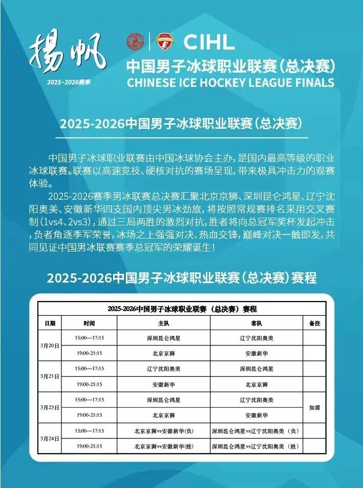 2025-2026赛季中国男子冰球职业联赛总决赛即将热血启幕!赛场水准全面升级,冰面对抗愈演愈烈,观赛氛围燃动全场!四支劲旅厉兵秣马、蓄势待发,究竟哪支队伍能突出重围、登顶冠军宝座,书写属于中国男冰的全新传奇,答案即将在冰场揭晓!