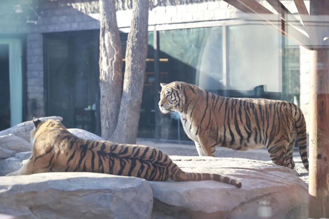 顺义虎乐园自带“野性滤镜”。这里既能近距离观看百兽之王的威猛姿态,也有适合亲子家庭的沉浸式体验。在采用环绕式落地玻璃设计的虎餐厅,边享美食边看老虎踱步嬉戏,趣味感十足。