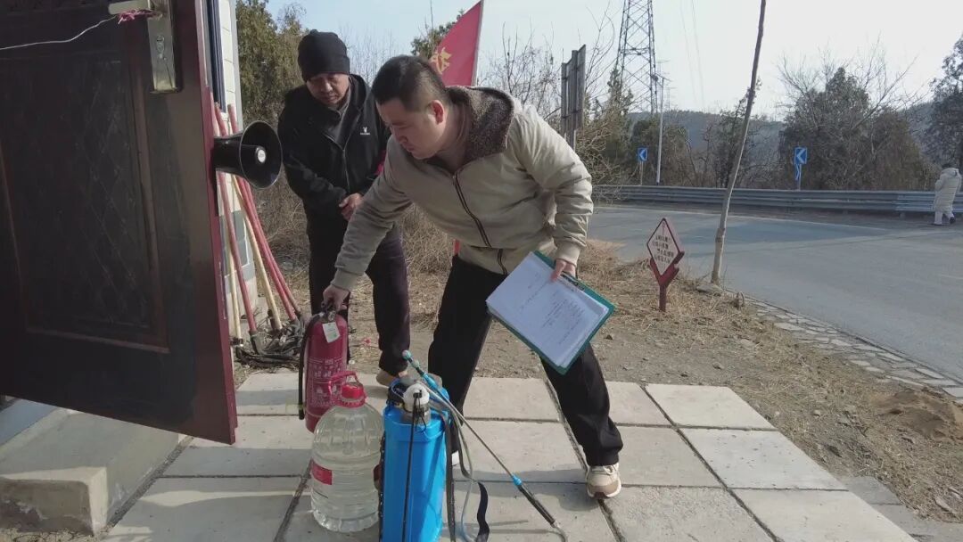 在雁翅镇田庄村一处防火值守点,护林员正在对周边山口、路口开展常态化巡逻值守。值守岗亭内,防火水桶、火种收集箱等工具配备齐全,扩音器循环播放森林防火提示。