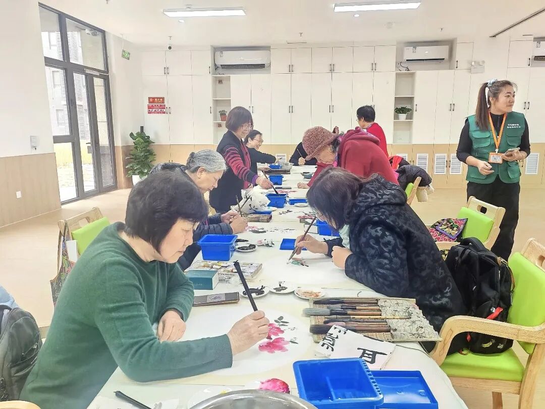 在老年学堂,居民们现场观摩书画作品,互动体验书法绘画,感受传统文化熏陶。