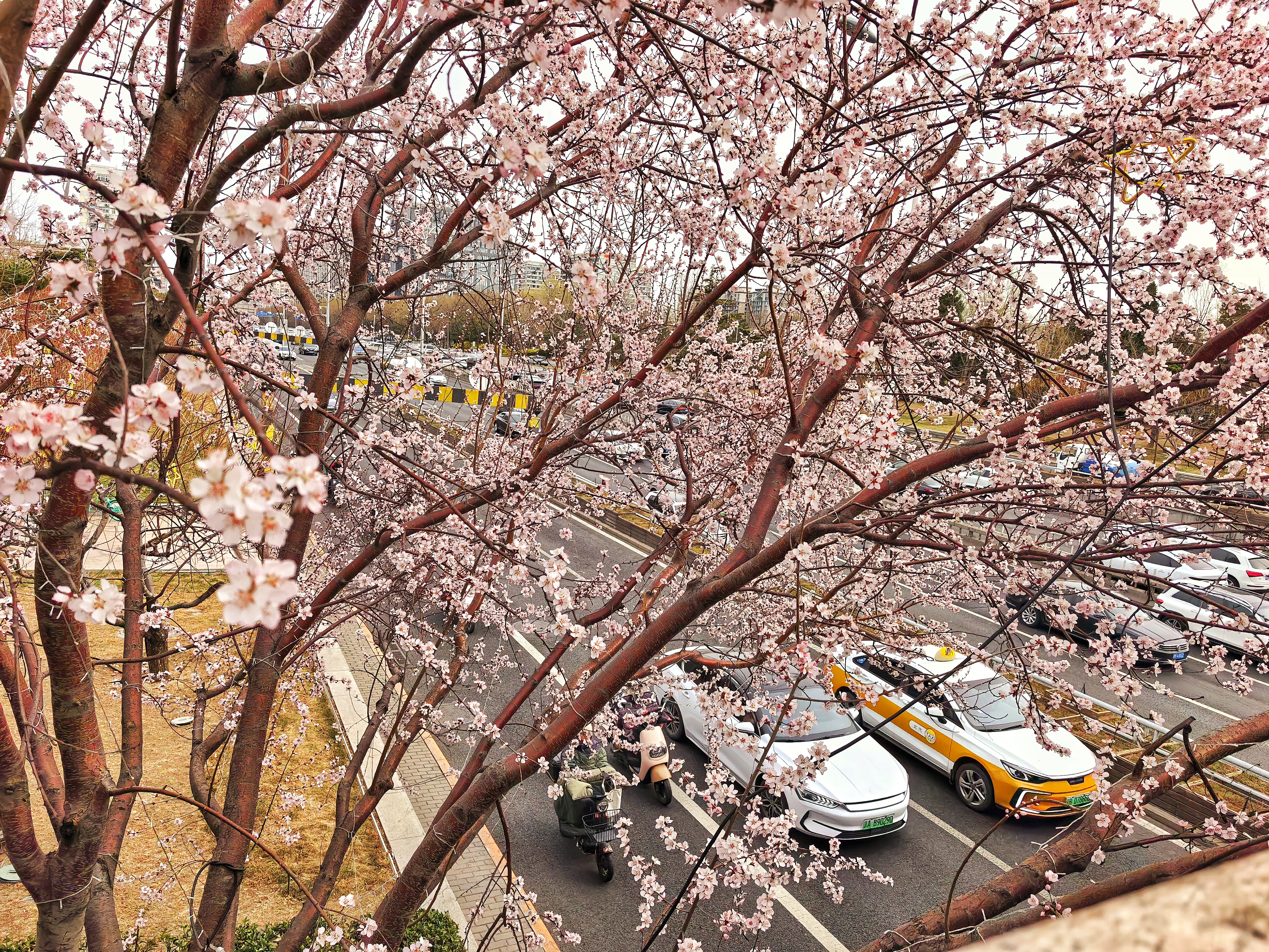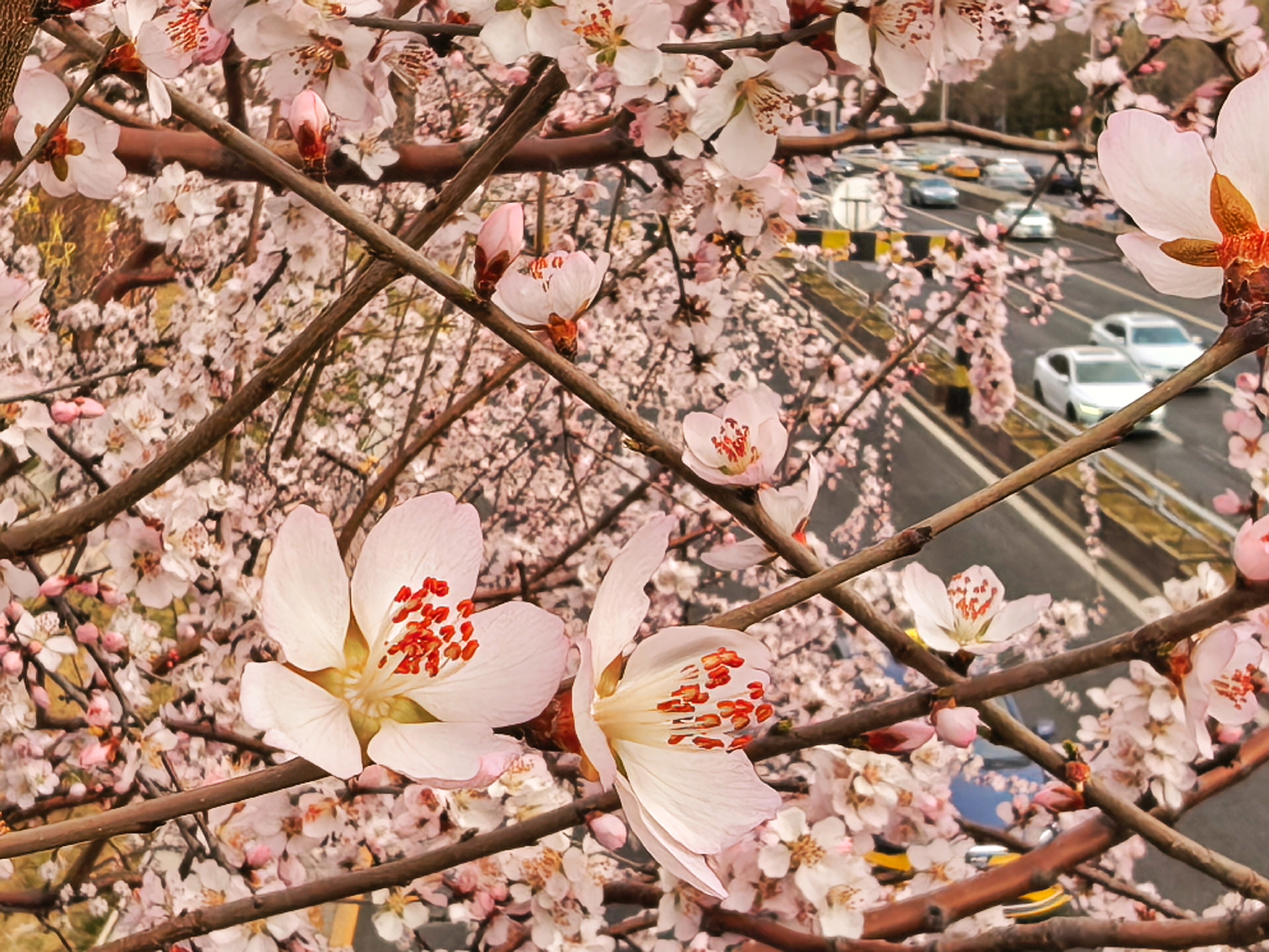 桥下是另一番光景。车流滚滚,无穷无尽似的,红的白的黑的车身,在日光下闪着匆匆的亮。那声音是沉实的,轰轰地,像城市不歇的脉搏。车过去,带起一阵风,又一阵风。桃花便在风里点点头,又摇摇头。