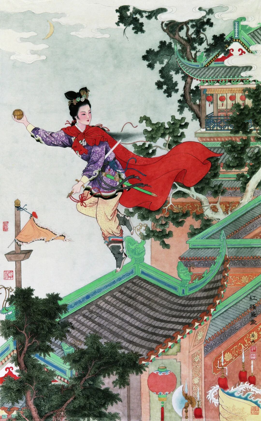 20世纪50年代至60年代,是父亲艺术创作的高峰时期,年画佳作频出,如《送戏到村》《嫦娥奔月》《百岁挂帅》《白蛇传》等,都是他在年画艺术上的经典之作。《送戏到村》是父亲在1958年去农村体验生活时,看到当地农民热烈欢迎城里剧团下乡演出的感人场景后,萌发了创作激情。这幅作品取材创意新颖,构图巧妙,人物形象鲜明生动。戏中的演员“穆桂英”与农村的劳动模范“穆桂英”握手相互问候的场面跃然纸上,仿佛超越时空,耐人寻味,具有强烈的时代感,作品被中国美术馆收藏。《嫦娥奔月》创作于1955年,作品从选题到立意,从构图到人物的刻画,从刚劲流畅的线条到绚丽典雅的色彩,都达到和谐完美的境界。特别是嫦娥轻舒广袖,回眸人寰的神情,再现了美丽神话的艺术魅力。《嫦娥奔月》一经问世便广为流传,20世纪50年代即被中国美术馆收藏。入选“新中国美术60年”大展及画集。《嫦娥奔月》作品的照片陈列在美国航空航天博物馆,以表明早在远古时代,中国人就向往奔向月球。多年来,《嫦娥奔月》被应用在中华老字号“稻香村”月饼的精美包装上,以美好的形象和寓意,把节日的美好祝愿带给千家万户。《百岁挂帅》是父亲在1964年根据古代戏曲,《十二寡妇征西》创作的年画,歌颂了佘太君百岁高龄,老当益壮,英勇卫国的民族英雄气概,对佘太君、穆桂英、杨文广、七娘的性格特征进行深入研究,人物形象各具特色。这幅作品充分彰显出他在古代刀马人物绘画方面的精湛艺术。作品在1984年被评为第三届全国年画二等奖。年画四条屏《白蛇传》,以优美动人的神话传说《白蛇传》为题材创作的彩色连环画十六幅,以四条屏的年画形式印刷出版。这种年画是通过多幅画面连续完整的叙述一个故事,也称“工笔重彩连环画”。他对故事中的主要人物形象的刻画和每幅环境细节的处理,都进行了缜密思考,反复推敲,精心设计。他笔下的白娘子、许仙和小青求真、求活,求在灵气上显个性。特别是追求美好爱情和幸福的白素贞,秀美之中蕴含刚劲之气,摒弃传统仕女的柔弱之态。在画面人物与景物的布局结构上,注重意境和神韵,力求通过典型环境烘托故事情节和人物的情态。作品对于室内的景物描绘细致入微,借景抒情,情景交融,增强了作品的艺术感染力。