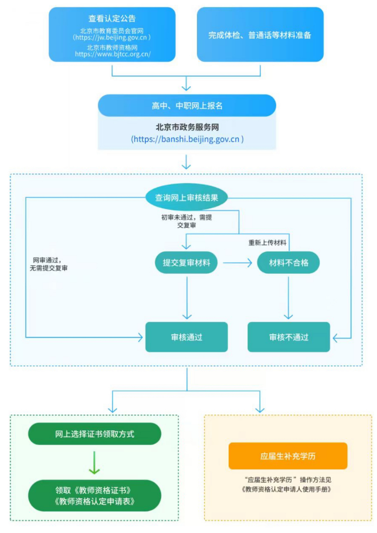 北京市高中、中职教师资格认定流程图如下: