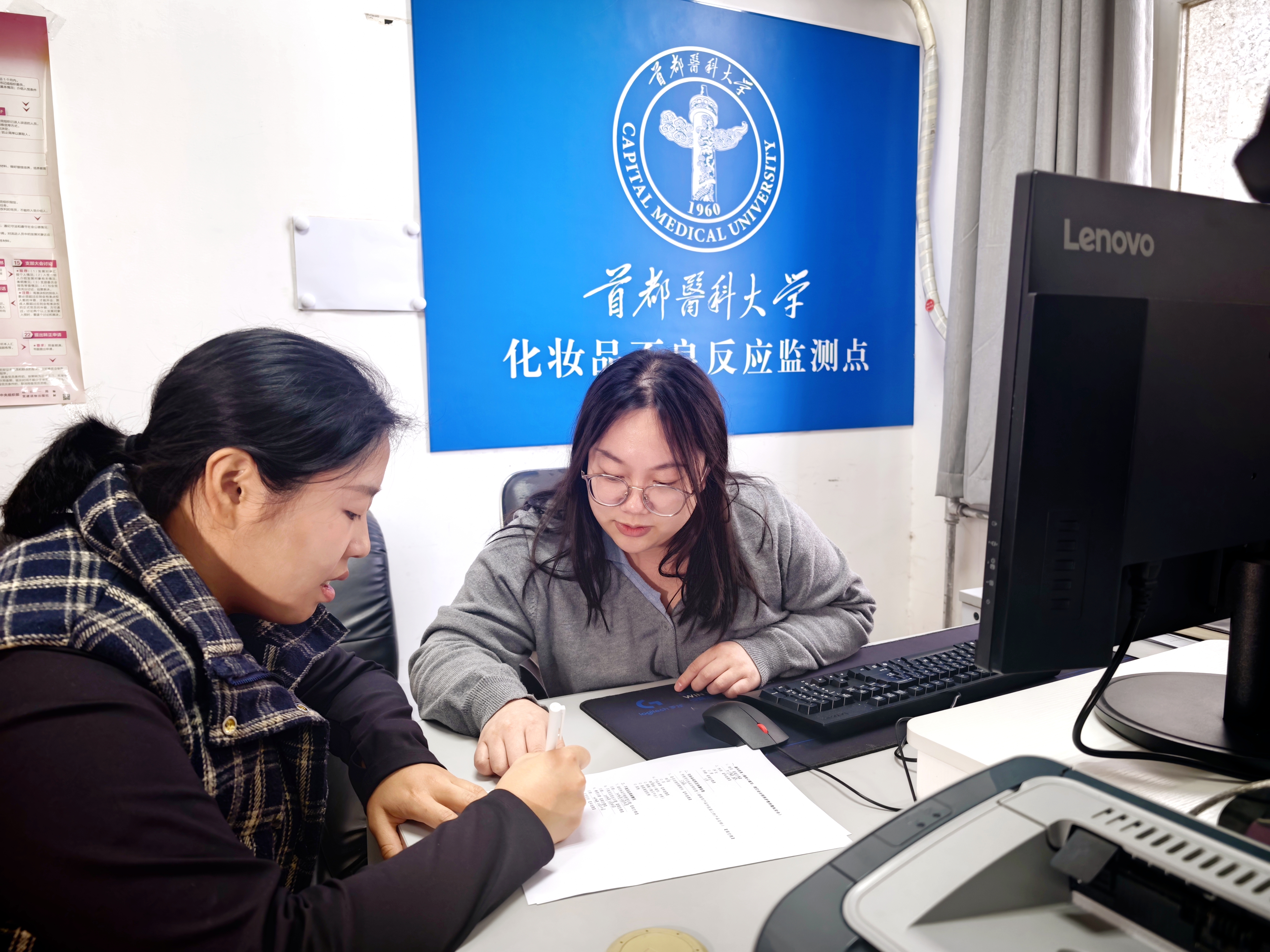走进首都医科大学阶平楼,新启用的监测点办公室窗明几净,负责老师正指导一名学生填报化妆品不良反应信息。记者凑近一看,填报单上详细列着化妆品名称、不良反应症状、发生时间等十余项填报内容。