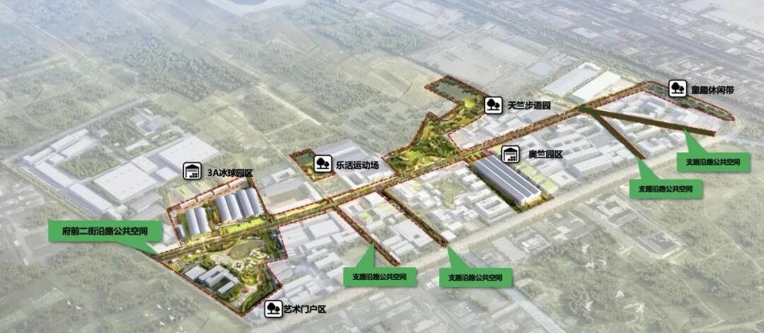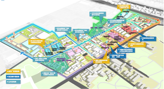 项目打破片区内各主体的封闭边界,对标国际化“无界体育街区”理念,拆除部分厂房、园区围栏,释放超2万平方米公共空间,开放沿街建筑主体边界,打造边界消融、开放共享的街区形态。同时,市区两级政府投资统筹支持道路、市政管网、慢行系统与公园绿地更新改造,构建“一街四路”为骨架、六大主题功能区点缀的公共空间景观结构,推动交通、生态、休闲功能深度融合,为高附加值业态植入提供“即投即用”的优质基础设施。