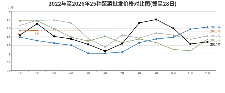 2月份,受春节节日效应影响,蔬菜价格整体呈现先升后降走势,批发价格处于近五年次低位。春节前部分冬储菜、南方菜供应偏紧,节日消费需求增加,推动蔬菜价格小幅上涨。春节过后,随着河北等周边产区蔬菜大量上市,市场供应迅速恢复,价格整体止涨回落。