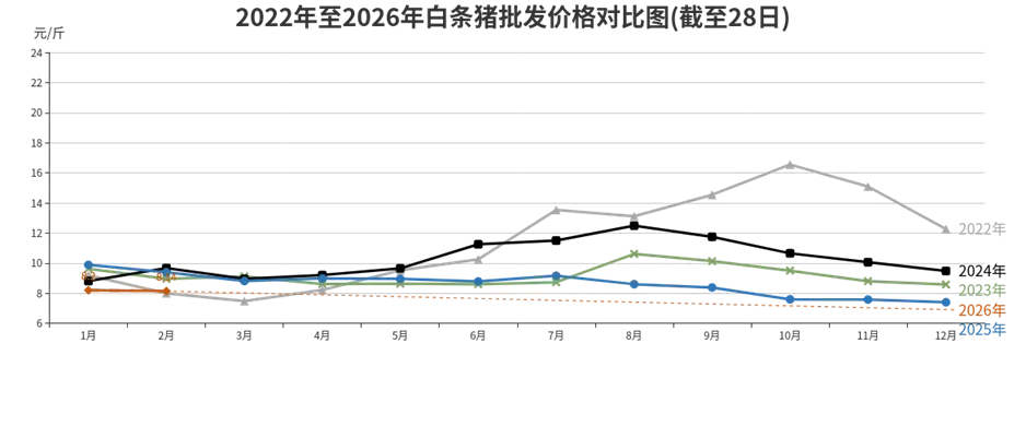由于各大生猪产业集团和规模猪场标猪出栏增加,节日效应提振作用有限,猪肉批发价格环比微幅回落,同比明显下降,处于近五年次低位。
