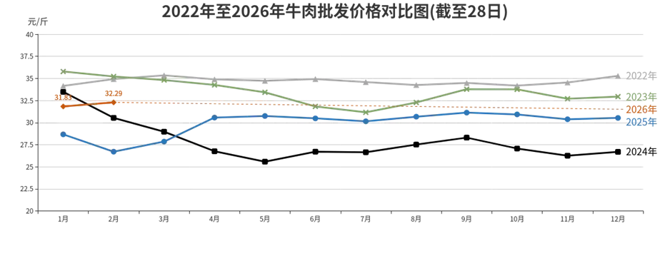 牛肉批发、农贸、超市价格分别为每斤32.29元、34.77元、42.47元,环比涨幅分别为上涨1.45%、上涨3.33%、下降0.65%,同比涨幅分别上涨为20.89%、6.89%、13.13%。