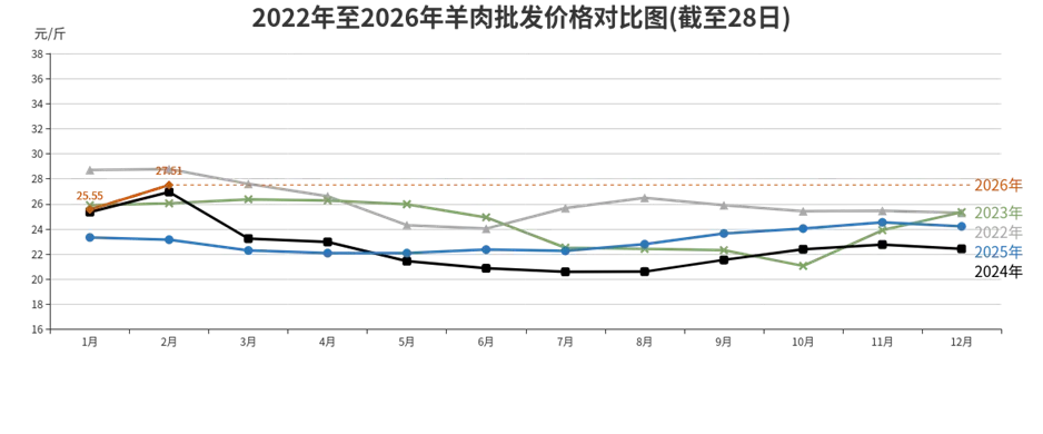 羊肉批发、农贸、超市价格分别为每斤27.51元、38.09元、45.88元,环比涨幅分别上涨为7.67%、3.87%、2.71%,同比涨幅分别上涨为18.83%、5.05%、9.42%。