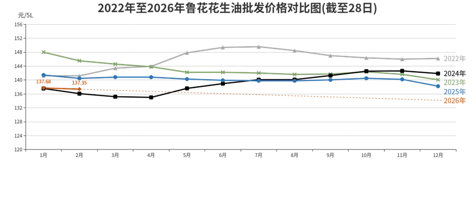 “鲁花”花生油批发、农贸、超市价格分别为每5升137.35元、150.33元、160.26元,环比涨幅分别为下降0.24%、上涨0.09%、下降0.22%,同比涨幅分别下降为2.21%、0.26%、0.82%。