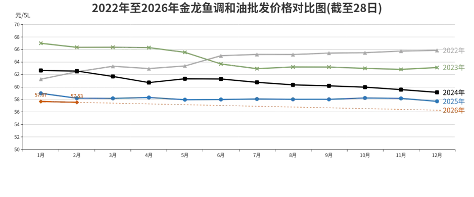 “金龙鱼”调和油批发、农贸、超市价格分别为每5升57.53元、67.05元、73.85元,环比涨幅分别为下降0.24%、持平、上涨1.23%,同比涨幅分别为下降1.15%、上涨0.4%、上涨1%。