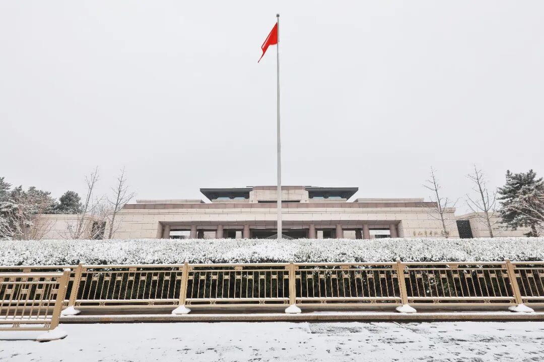 霜雪笼枝,寒色覆馆,立冬凝霜裹松柏,冬至素裹映圣地。苍松劲柏傲然挺立,大寒时节依旧青翠常青,恰如革命先辈历久弥坚的赤诚初心。