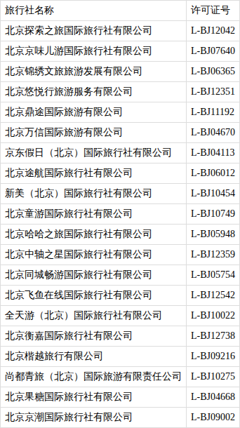 根据我市旅行社涉诉情况统计,现公示2026年3月2日至3月8日,北京市投诉量排名前十旅行社名单如下: