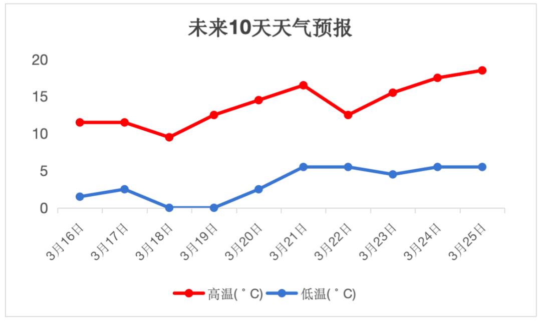 根据门头沟区气象台最新预报,未来10天潭柘寺地区最高气温为19℃左右,最低气温为0℃左右,日平均气温为5~12℃。