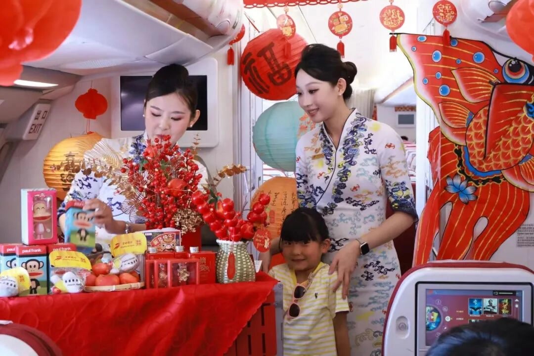 在保障运力畅通的同时,首都航空以细节服务传递新春暖意,让旅客在旅途中感受浓浓的年味儿与温情。春节前夕,首都航空组织在各属地出港航班上张贴“福”字贴纸,开展客舱新春主题布置,营造浓厚节日氛围;策划实施“京彩绽放,新年启航”春节主题航班活动,设置吉祥话祝福、年味知识问答等互动环节,打造集仪式感、文化性与互动性于一体的空中新春体验。同时,联合紫光园、东来顺等京城餐饮老字号,举办“青云启新,云端纳福”主题机上活动,将地道京味年俗与团圆温情融入空中服务,为旅客打造温暖贴心的“空中归家”体验。
