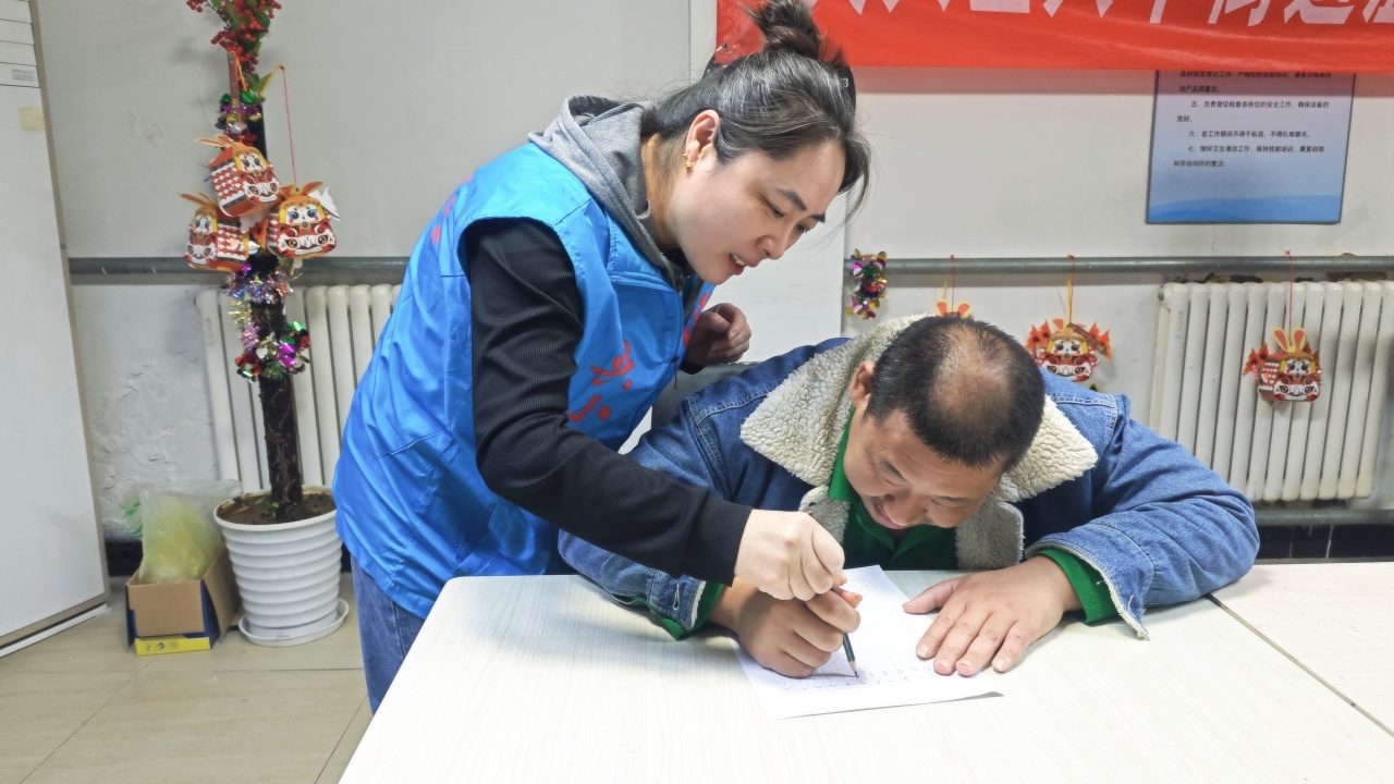 活动前期,驻点社工对园内残疾人的实际需求和参与能力进行了细致评估,并制定了详细的活动方案。在社工的专业指导下,志愿者们分工协作,有的协助园内残疾人朋友一起清理环境卫生、整理公共区域,共同营造整洁舒适的“家园”;有的则陪伴在残疾人朋友身边,与他们一同练习硬笔书法,在一笔一划的交流中鼓励他们表达自我、增强自信。这种“社工统筹策划、志愿者协同参与、服务对象互动融入”的模式,不仅有效改善了温馨家园的环境面貌,更通过平等参与、互助合作,增强了残疾人群体的社会融入感和自我价值感。