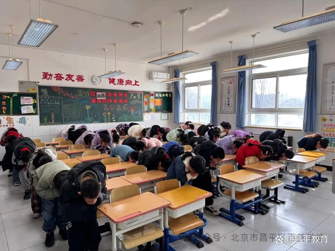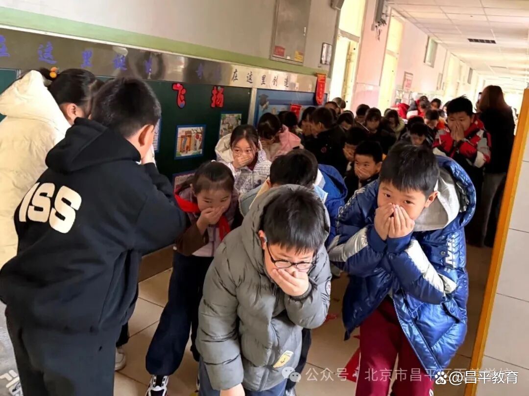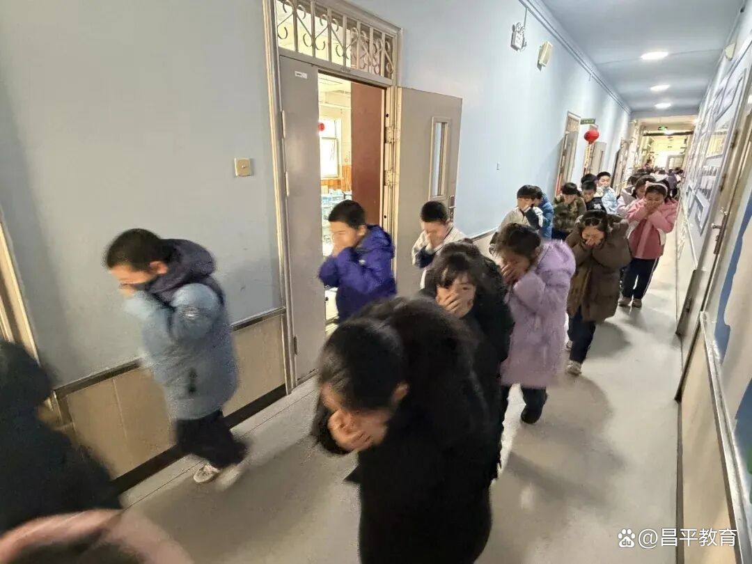 天通苑学校组织全体师生开展地震、消防应急疏散演练。第一声警报拉响后,教室内的孩子们迅速抱头、蜷身,敏捷地躲到课桌下——短短12秒的“黄金避险”,全员到位。听到第二声警报,师生们弯腰低姿,湿毛巾捂口鼻,沿着预定路线快速撤离。仅用2分30秒,全校1700余名师生全部集结操场,无一人掉队。