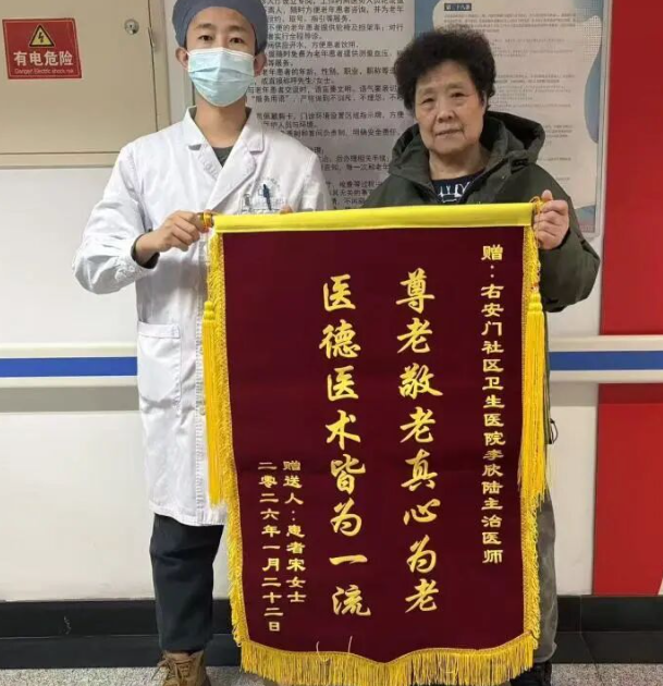 近日,右安门社区卫生服务中心中医科李欣陆主治医师收到患者宋女士(70余岁)赠送的一面锦旗,锦旗上“尊老敬老真心为老,医德医术皆为一流”的金色大字,真挚地表达了宋女士对李欣陆大夫及科室团队的深深感激与高度认可。