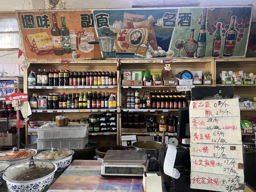抬头望去,天花板上老式灯棍、旧吊扇仍在服役。货架上端,贴着20世纪六七十年代的手绘水粉广告牌,“固体酱油”“藕粉”的画样已斑驳起翘。墙面上,“发展经济,保证供给”的红色标语赫然在目,这些计划经济年代的印记,成了老店独特的文化符号。