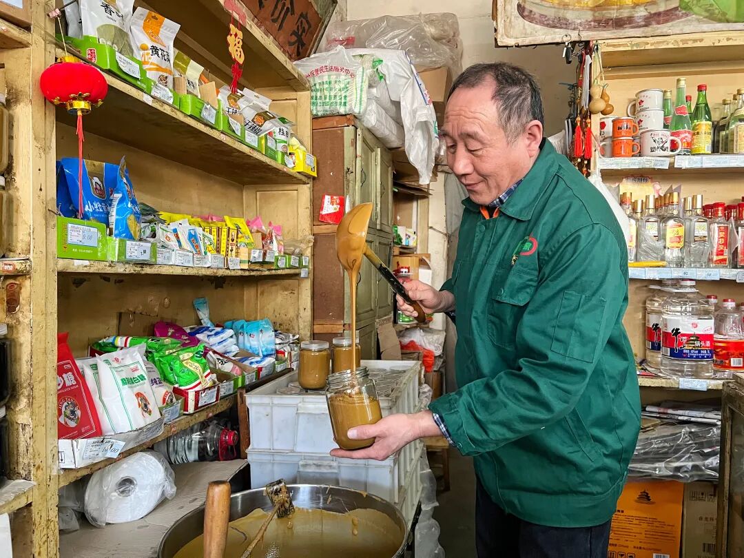 为适应现代人的健康需求,店里也推出了黑芝麻酱,但最经典的“二八酱”口味始终如一。“老顾客就认这个,绝不能变。”店铺至今保留着“零打”的服务,街坊们拿着空瓶前来,店员手执长柄木勺,舀酱、装罐、称重,动作行云流水一气呵成。目前,这份独特的“散打芝麻酱技艺”已申报东城区非物质文化遗产,正待评审。