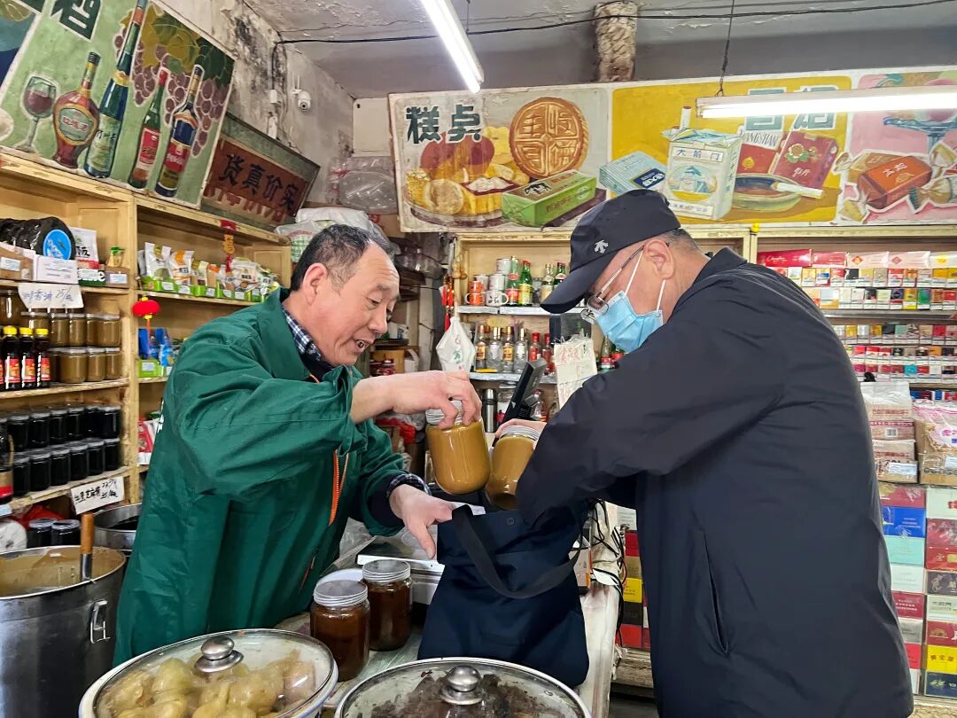 退休后又返聘回店的孟玉清师傅,在副食行业干了四十多年。从凭票供应到移动支付,他始终守着“服务老百姓”的初心,耐心地为年轻游客讲述老店历史,演示打酱工艺。对于从大兴、昌平远道而来的老主顾,店员会细心地将酱料封装严实;对于外地顾客,店里则义务代邮,只收酱钱和运费。这份朴实无华的人情味,让老铺成为了胡同里的“熟人社交场”。