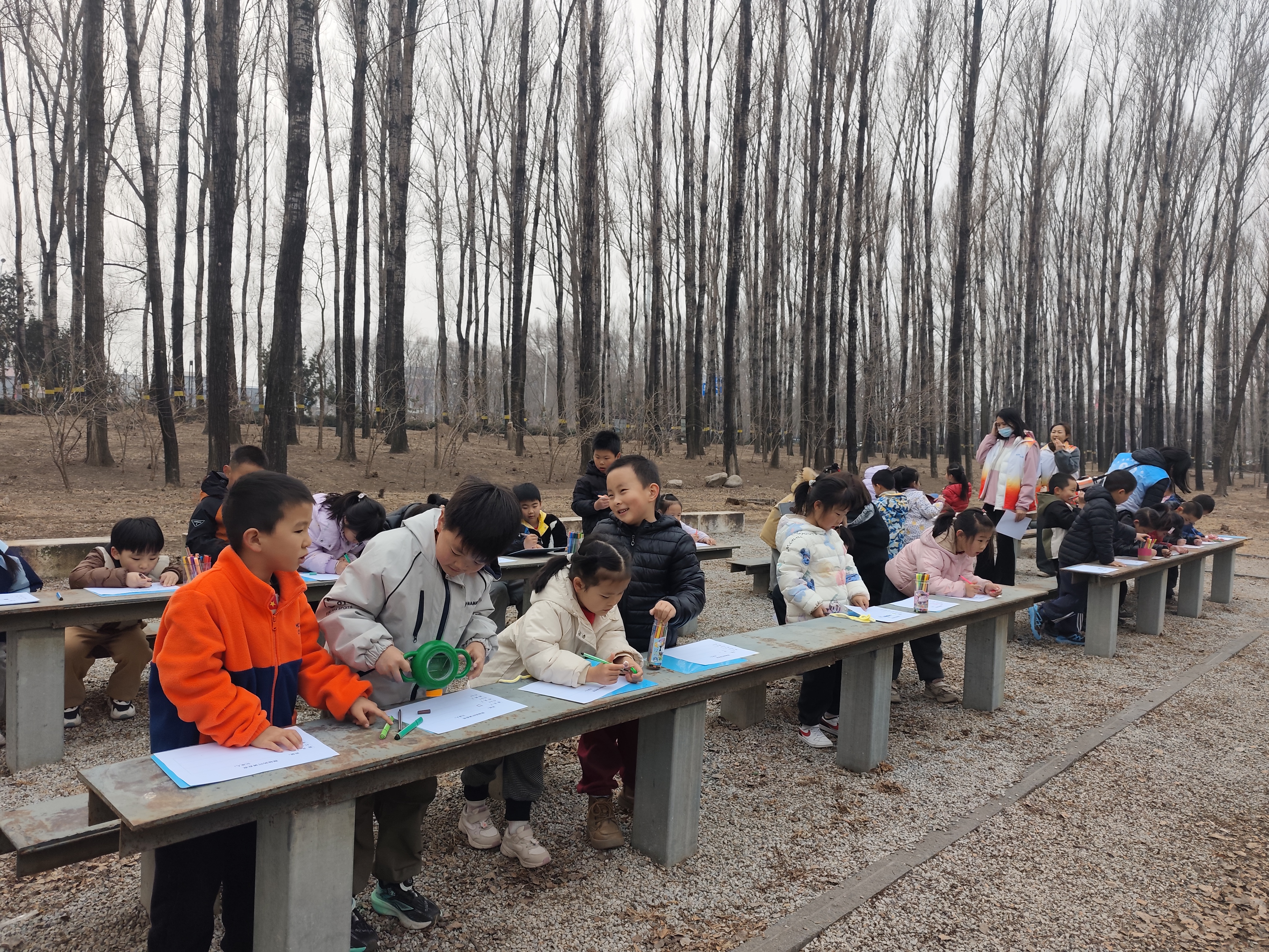 在榜样与工作人员的带领下,孩子们开启了环保护河实践行动,他们在妫河沿岸安全区域内认真践行垃圾分类、清理周边垃圾,将课堂上学到的环保知识转化为实实在在的行动。活动中,孩子们还化身小小探索家,手持放大镜观察树桩、落叶中的自然奥秘,触摸树皮纹理感受自然温度,更围坐林间用画笔将春日妫河的秀美生态绘于纸上,用稚嫩笔触记录对自然与家乡的热爱。
