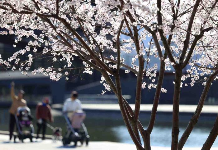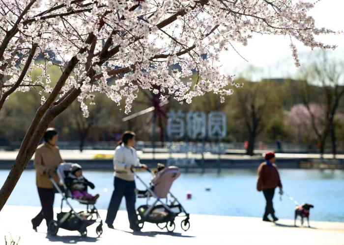 石景山首钢园三高炉秀池旁,桃花盛开,游客们在这里踏青赏花。